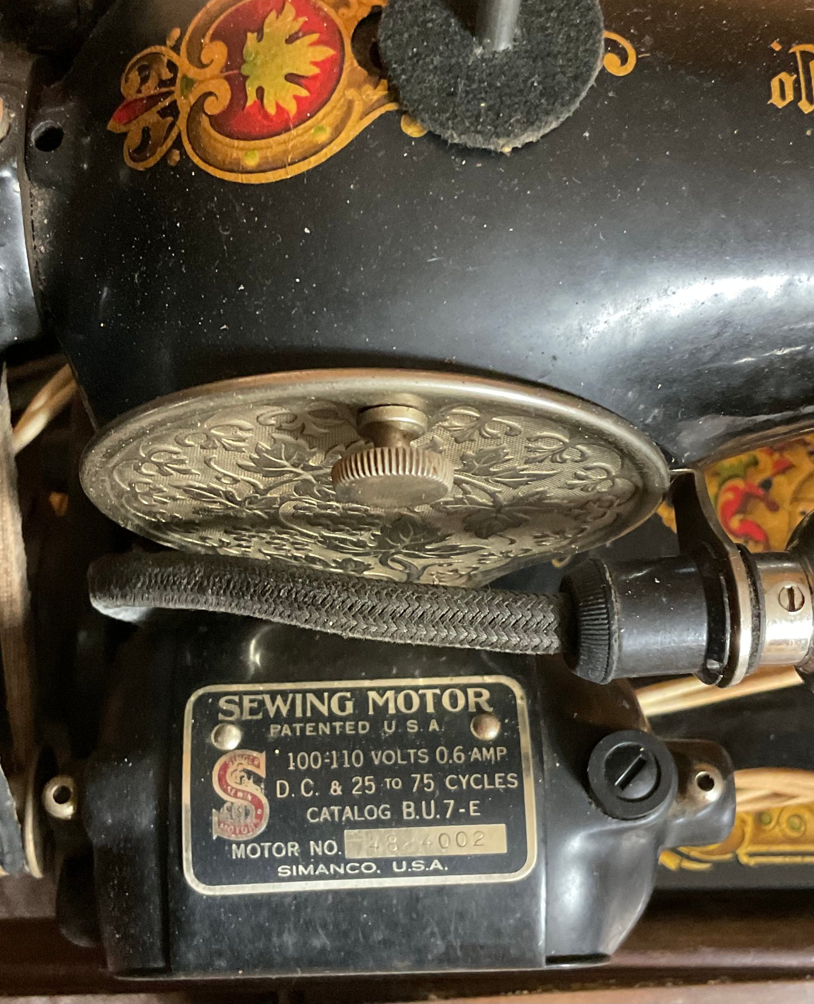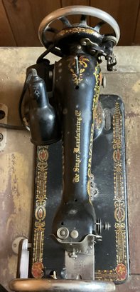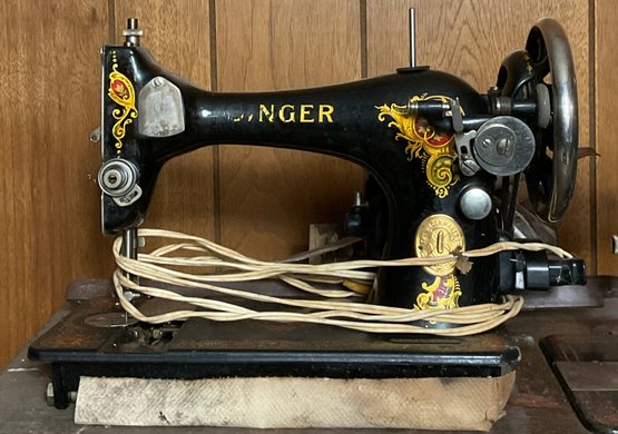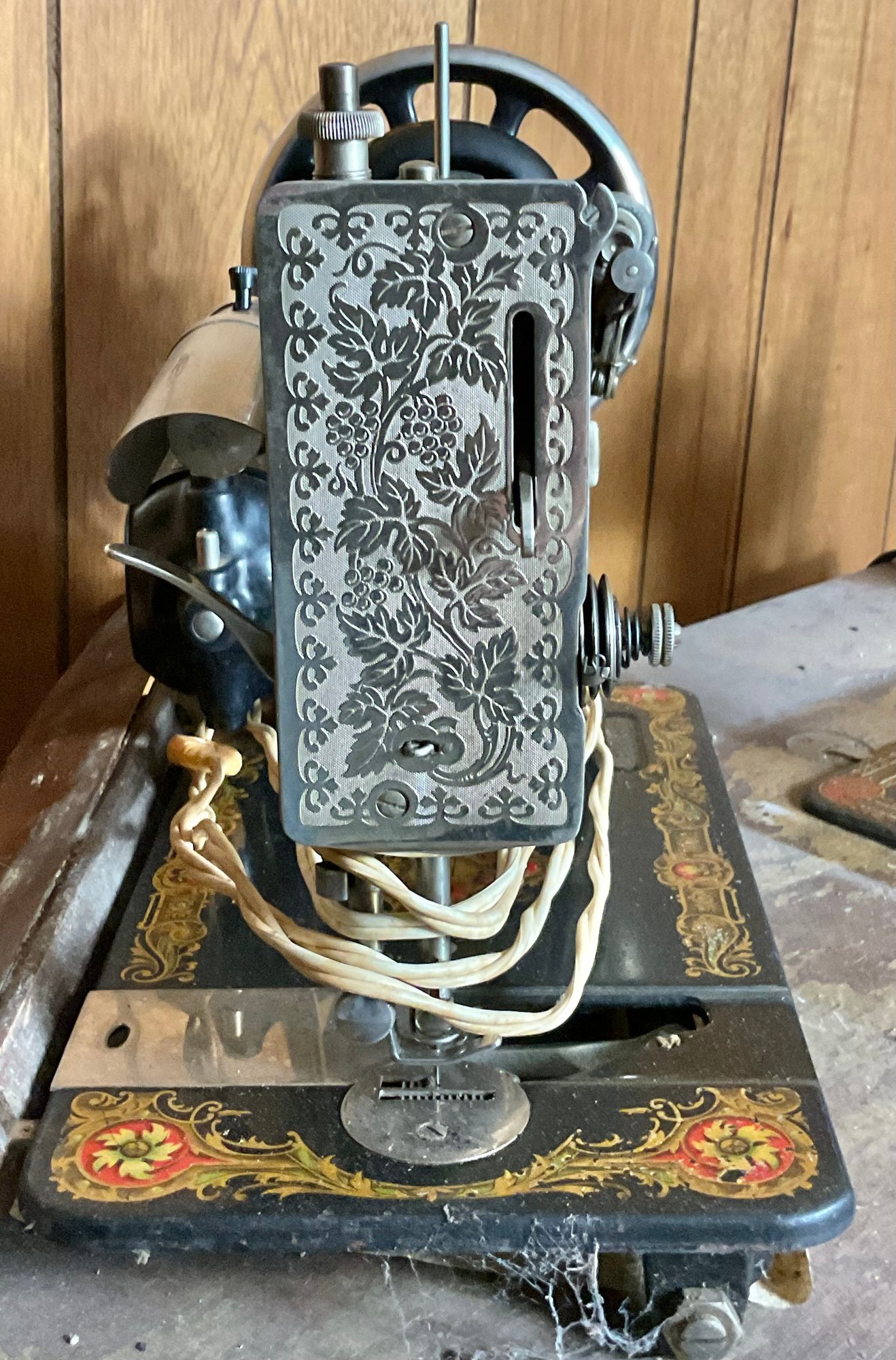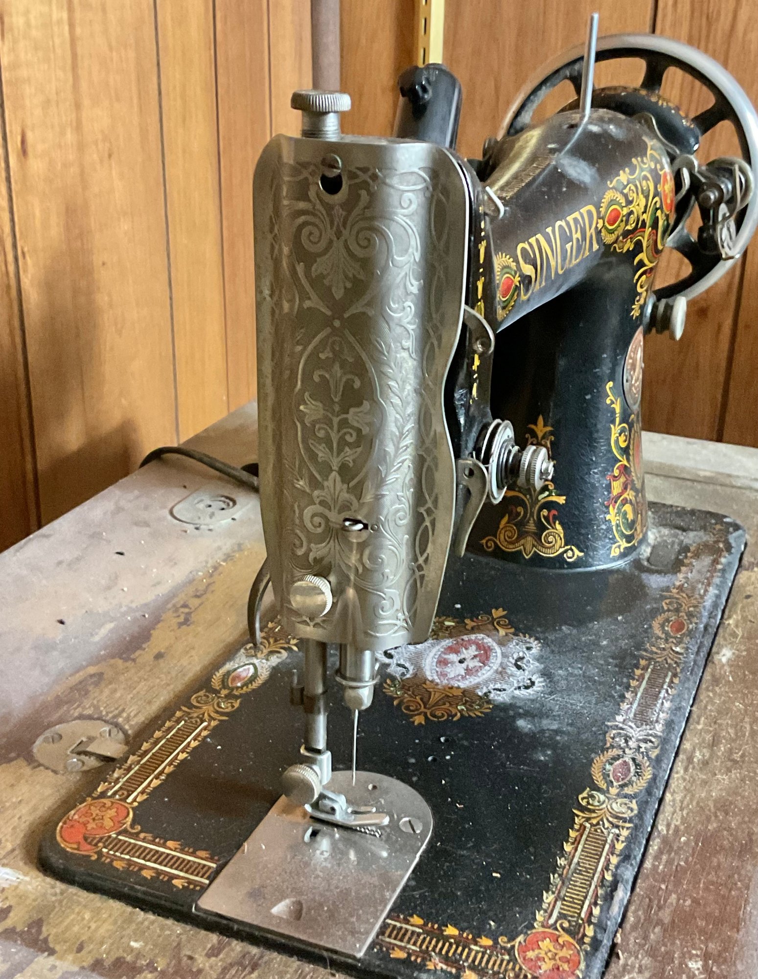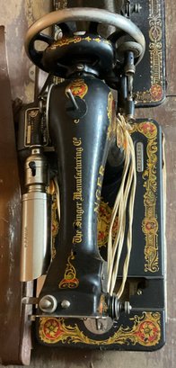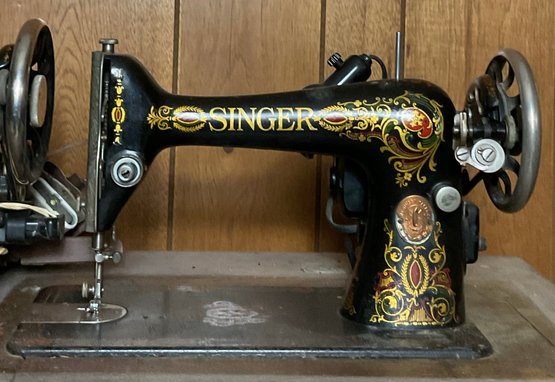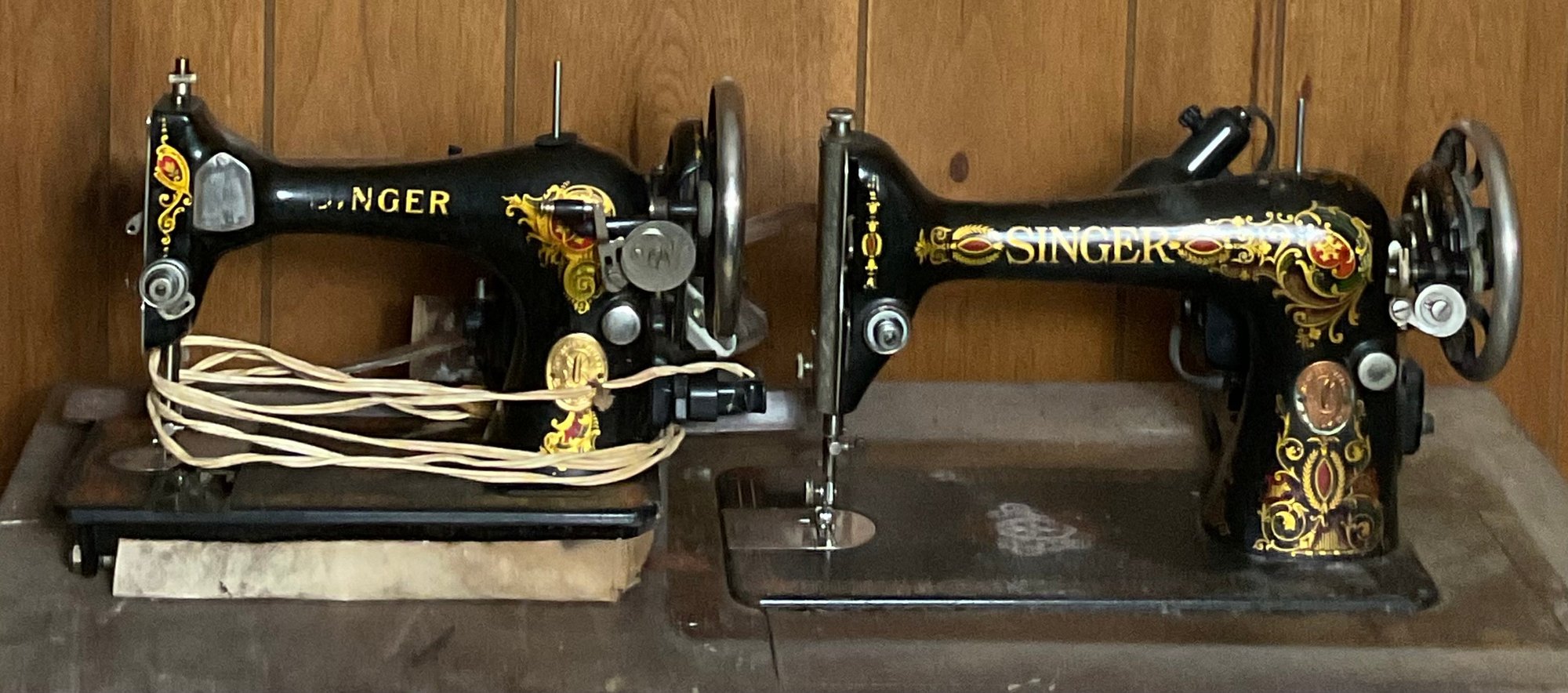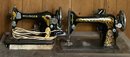 2 Antique Singer Sewing Machines - bright graphics - untested - good used condition