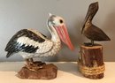 2 Carved Wood Pelicans - 7.5" & 8.5" - white one has beak chip - good used condition