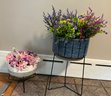 2 Faux Flower Pots On Wire Stands - 13'' tall 11'' wide & 28'' tall 18'' wide - good used condition
