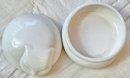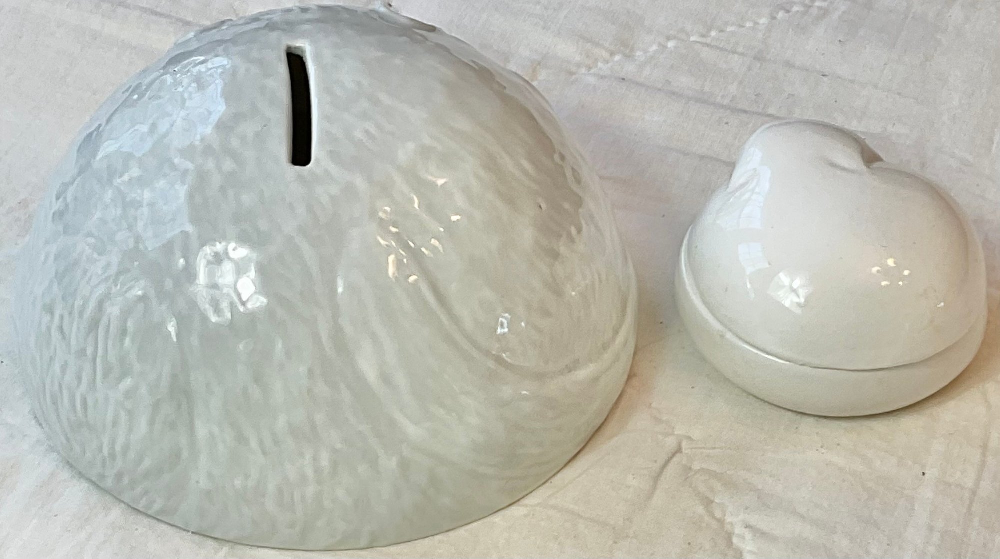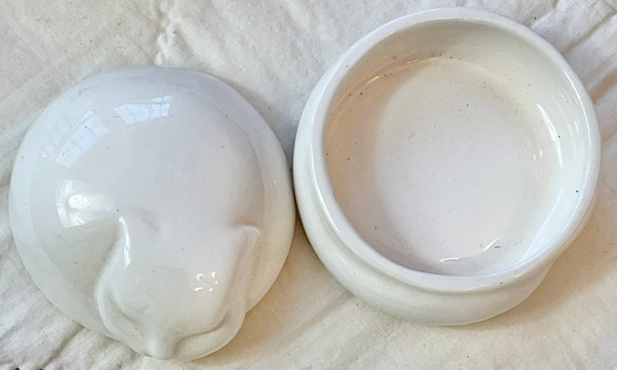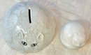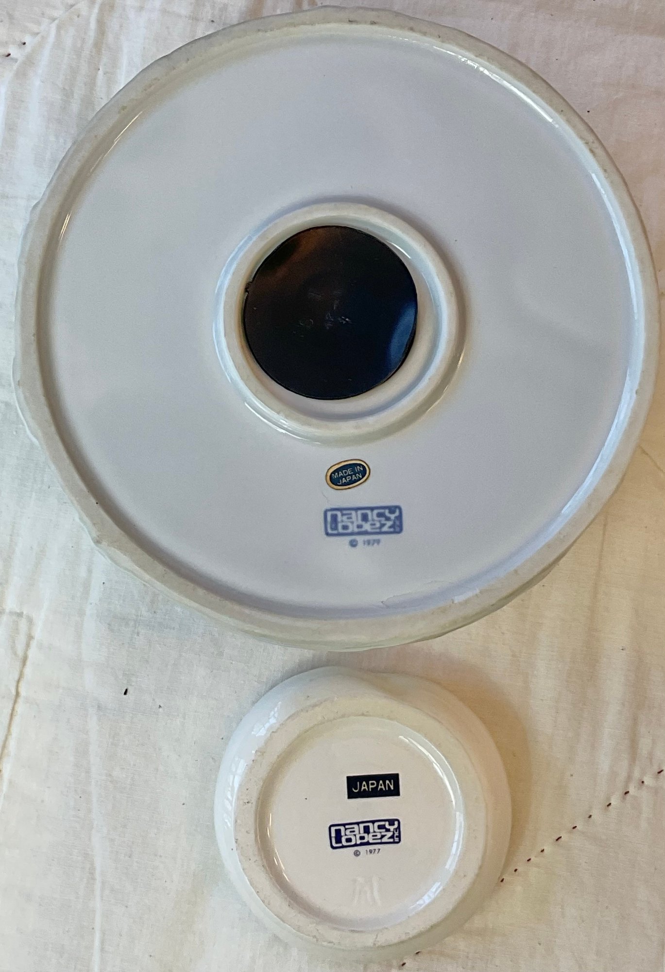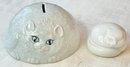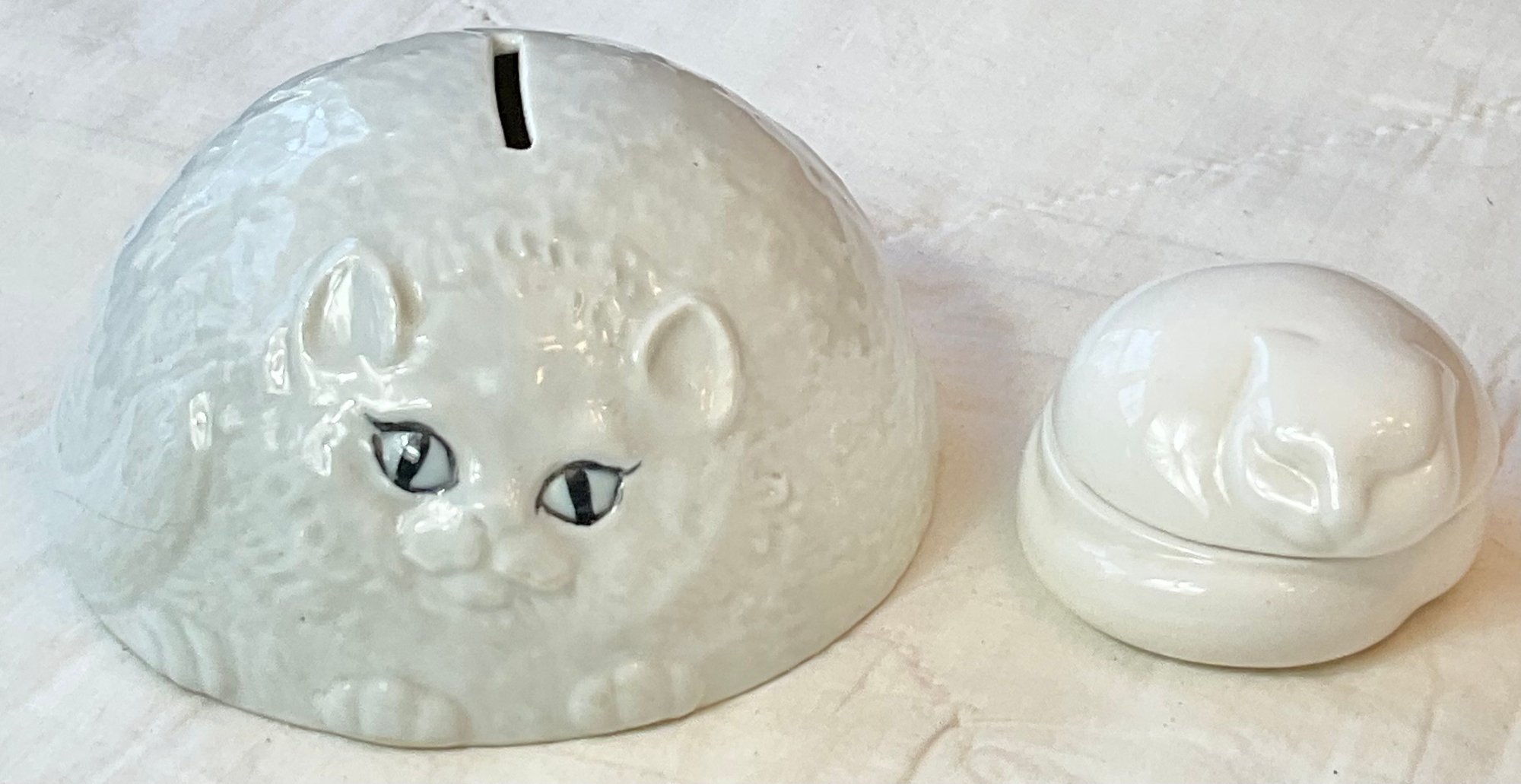 2 Nancy Lopez Ceramic Cats - bank 3.25” tall x 6.25” round - covered jar 2” tall x 3” round - no chips - good used condition