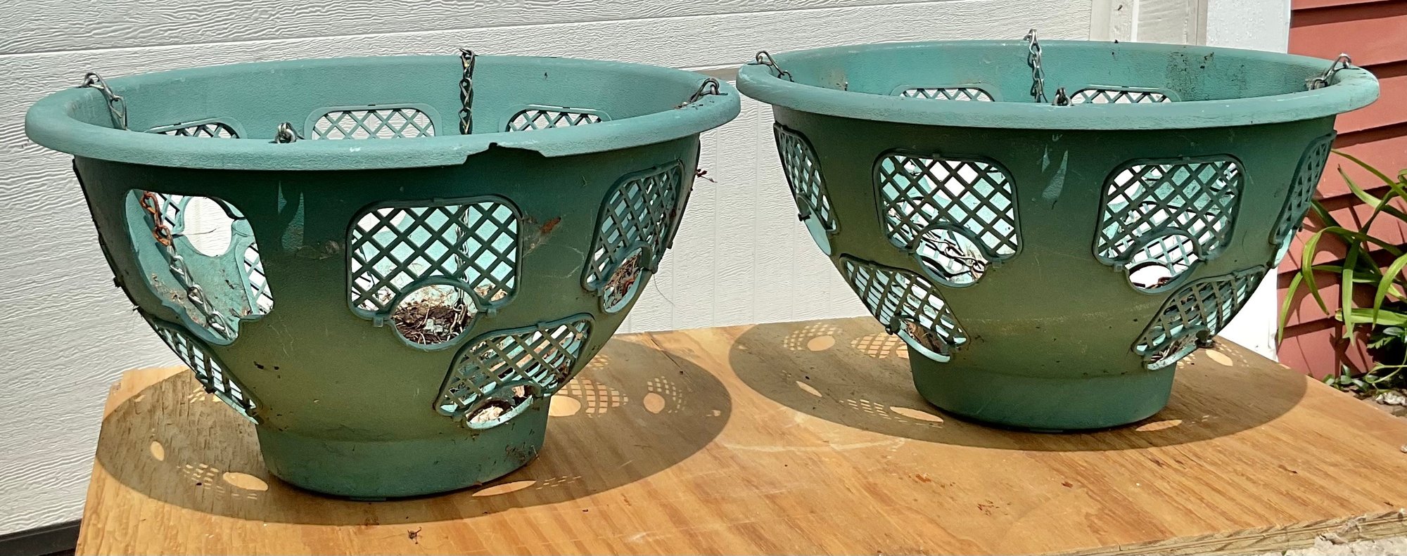 2 Plastic Hanging Plant Baskets - 8.5” tall x 15.25” wide - good used condition