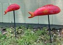 2 Porcelain Koi Fish Garden Statues - 17.5” & 18” tall on posts - 15” & 8.5” long - no chips - good used condition