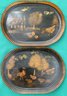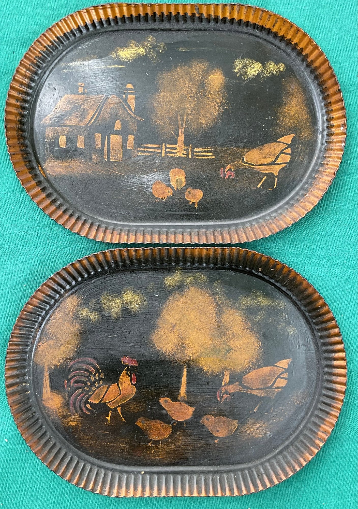2 Small Antique Toleware Painted Trays - Rooster/ Chickens - 8.5” long x 6.25” wide - good used condition