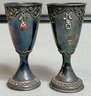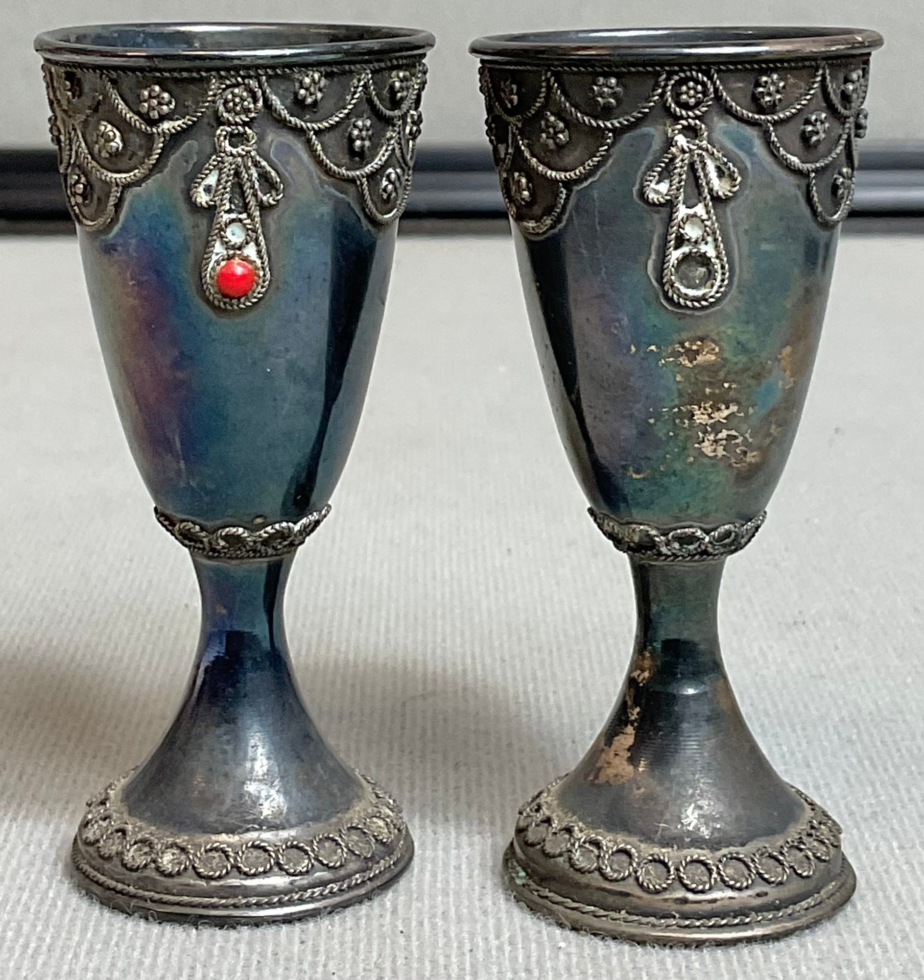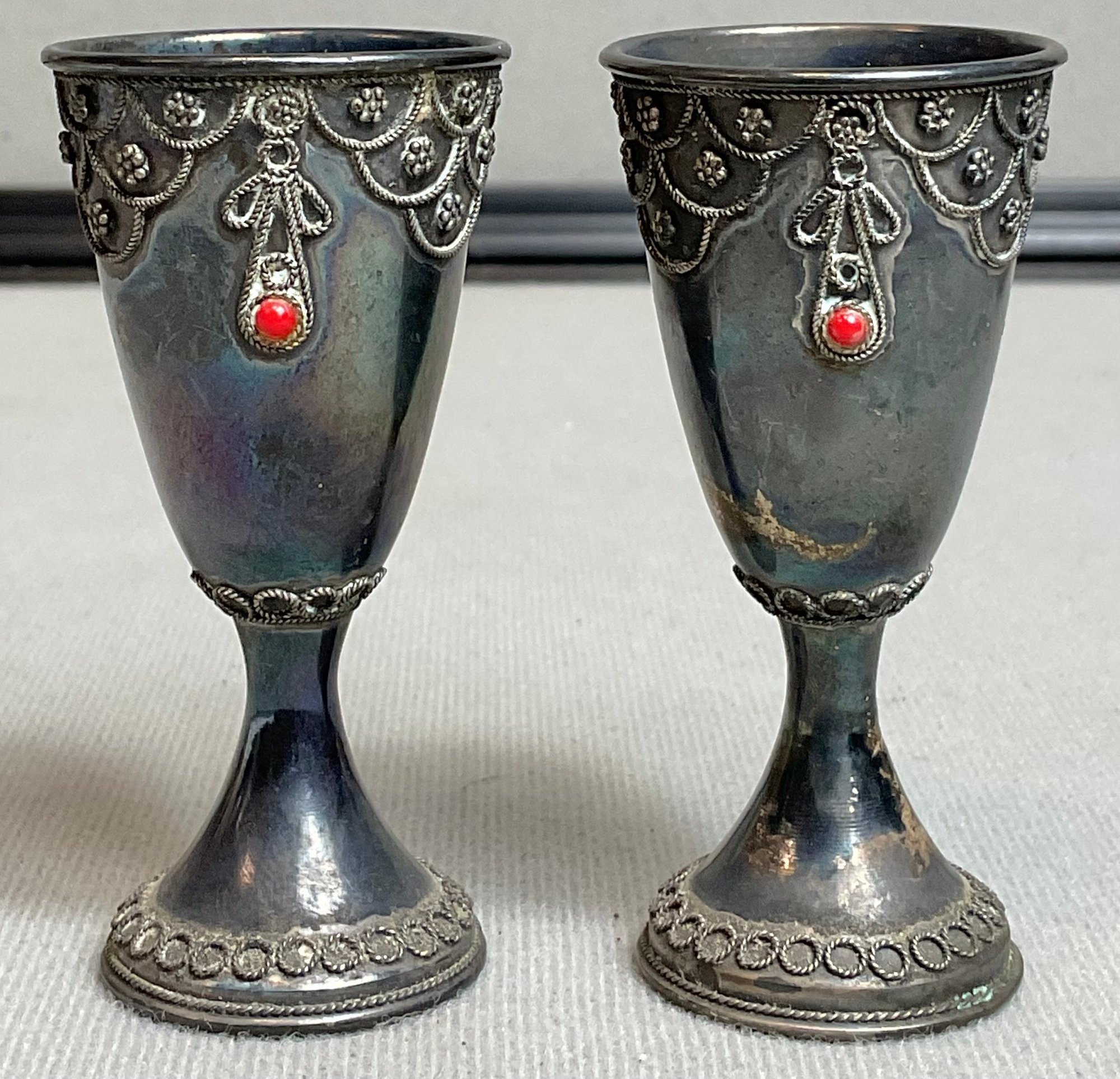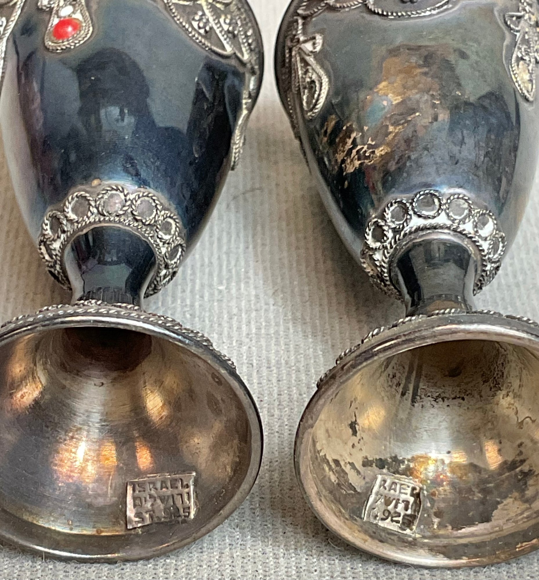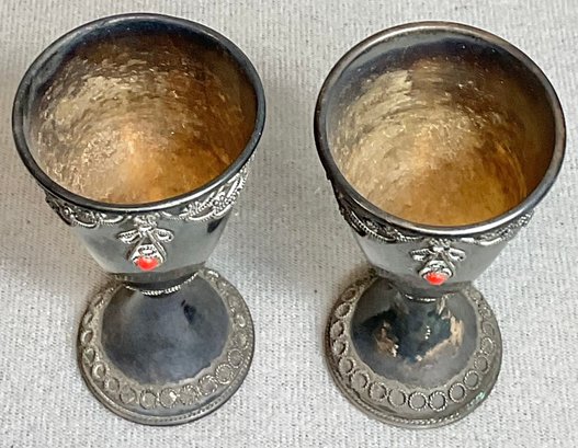 2 Vintage Israel Sterling Kiddush Cups With red stone cabochons (some missing) - 2 7/8” tall - total weight 40 grams - good used condition