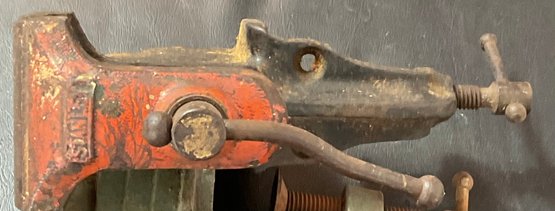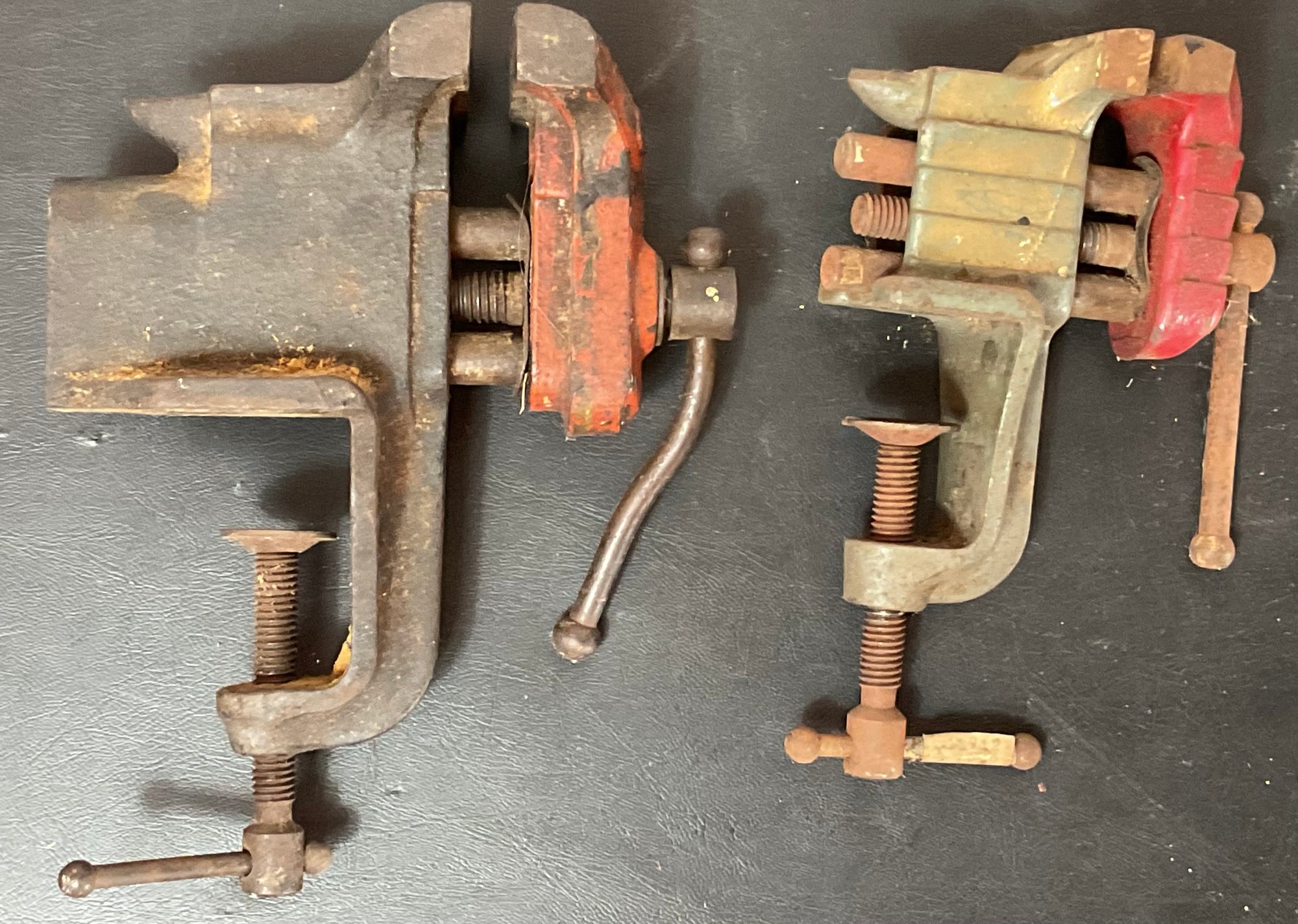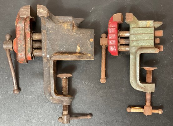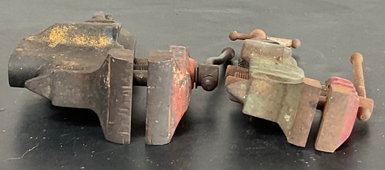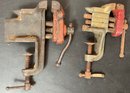 2 Vintage Stanley Mini Clamp Anvil Table Vises - jaws 1 5/8” & 2 3/8” - work - good used condition