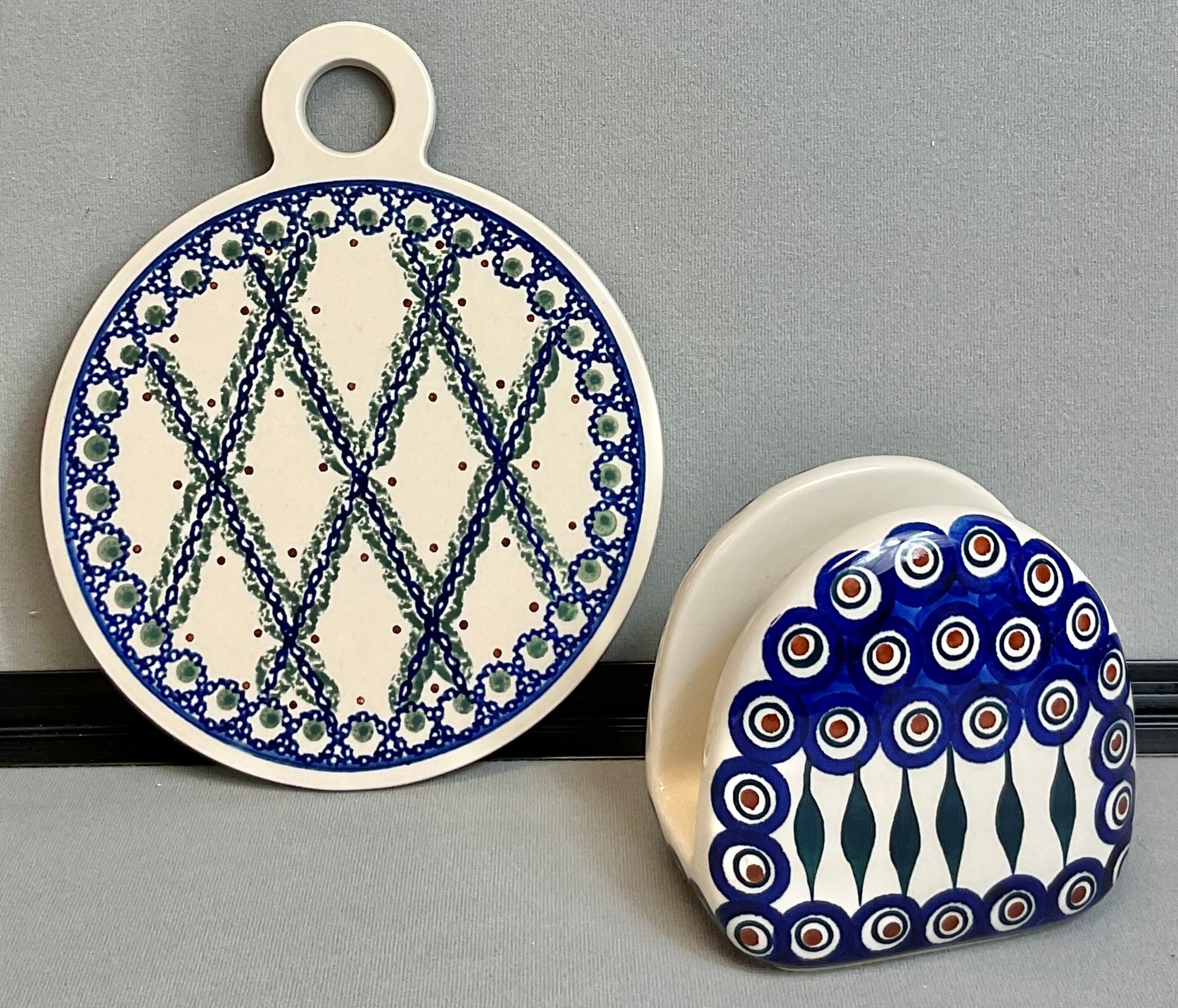 2pc Polish Pottery - Trivet 9.5” long x 7.5” wide & Napkin Holder 4.75” tall x 5” long x 3.25” wide - no chips - good used condition