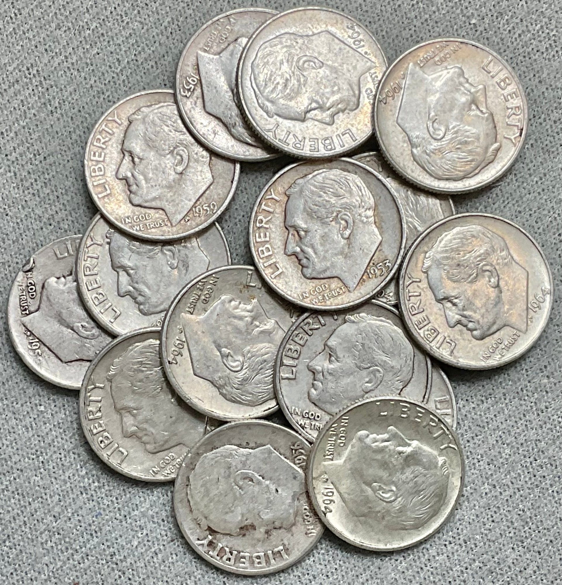 #3 - 15pc Silver Roosevelt Dimes - assorted dates - good used condition