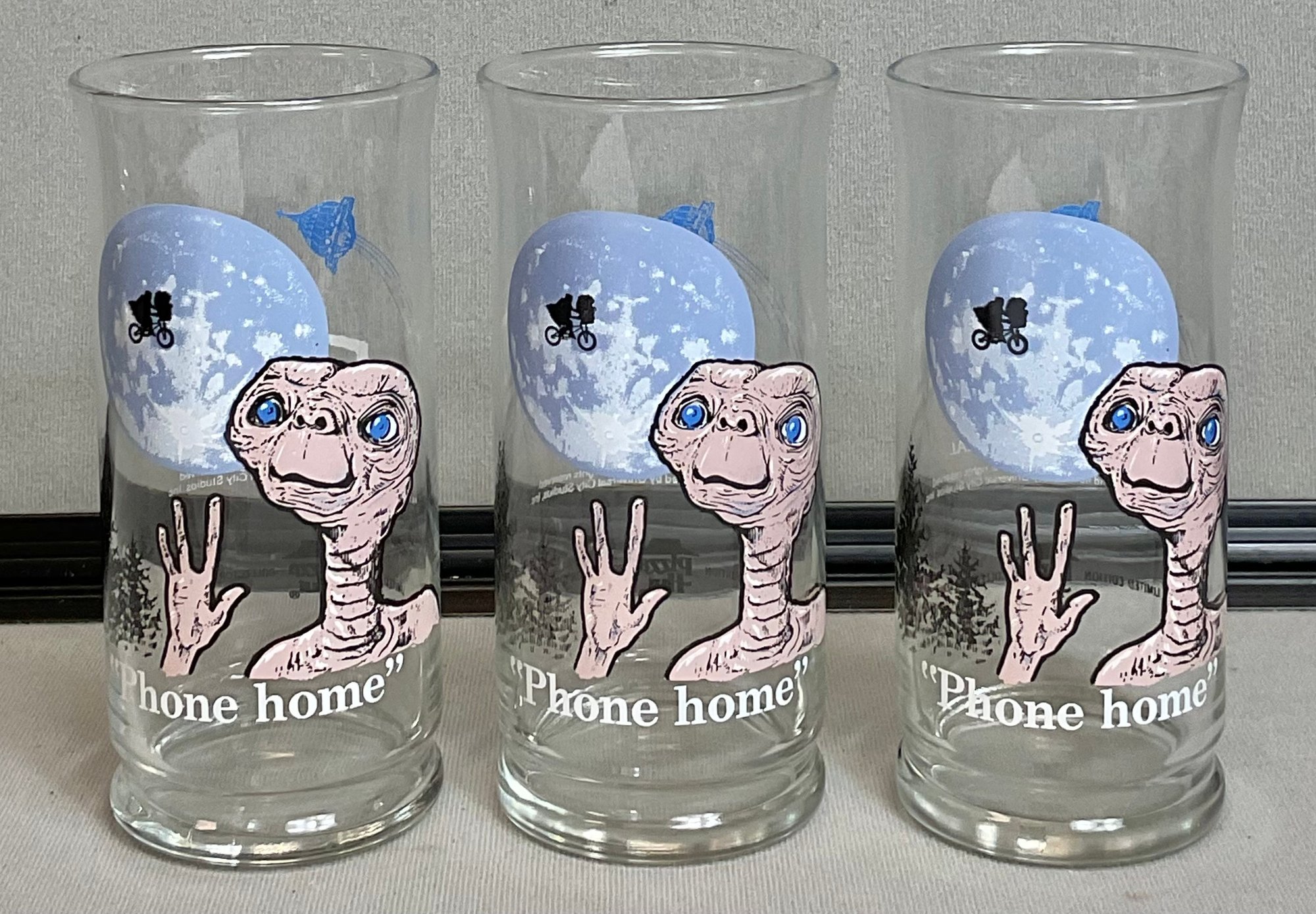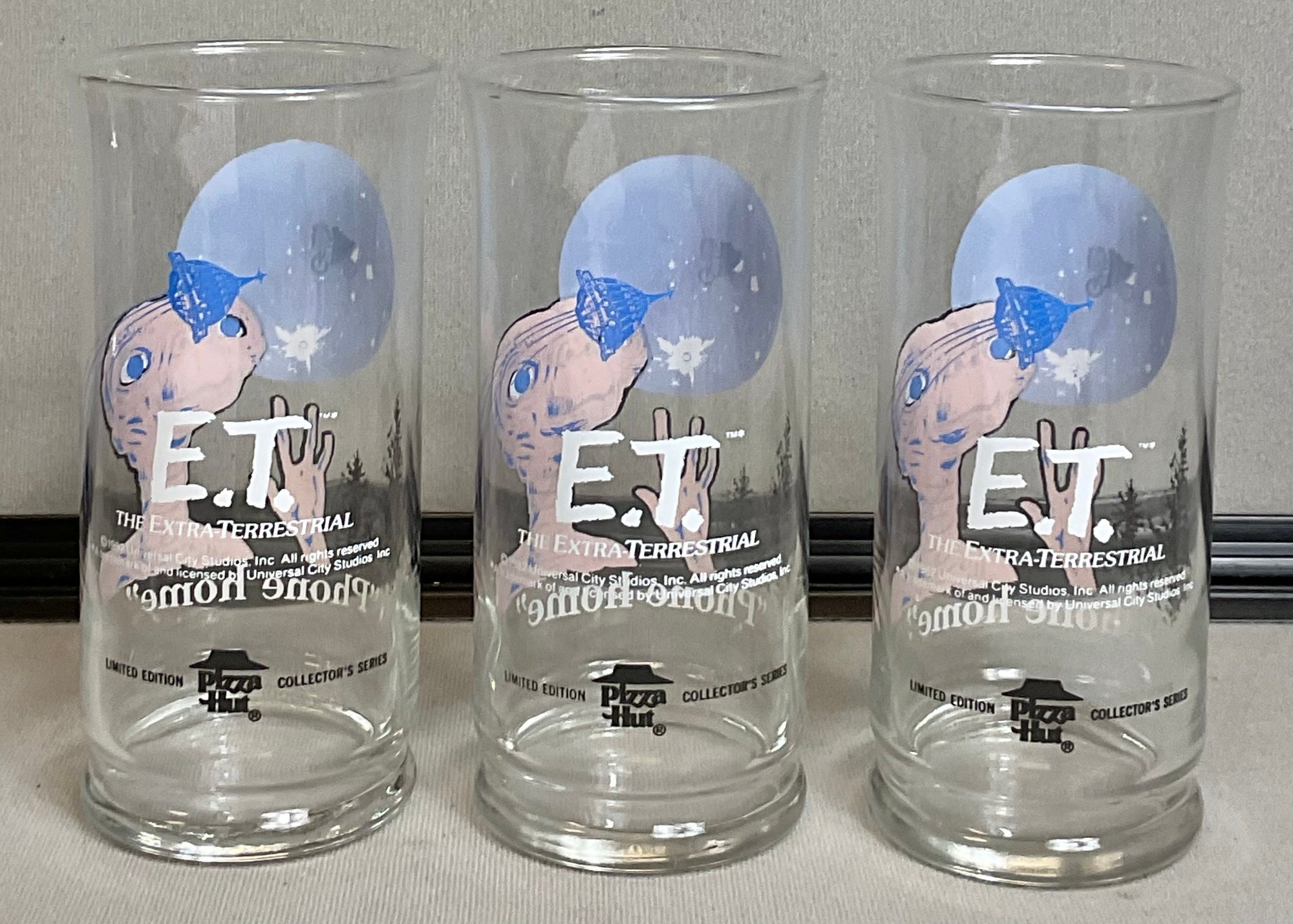 3 - 1982 E.T. The Terrestrial Pizza Hut Glasses - 6” tall - no chips - good used condition