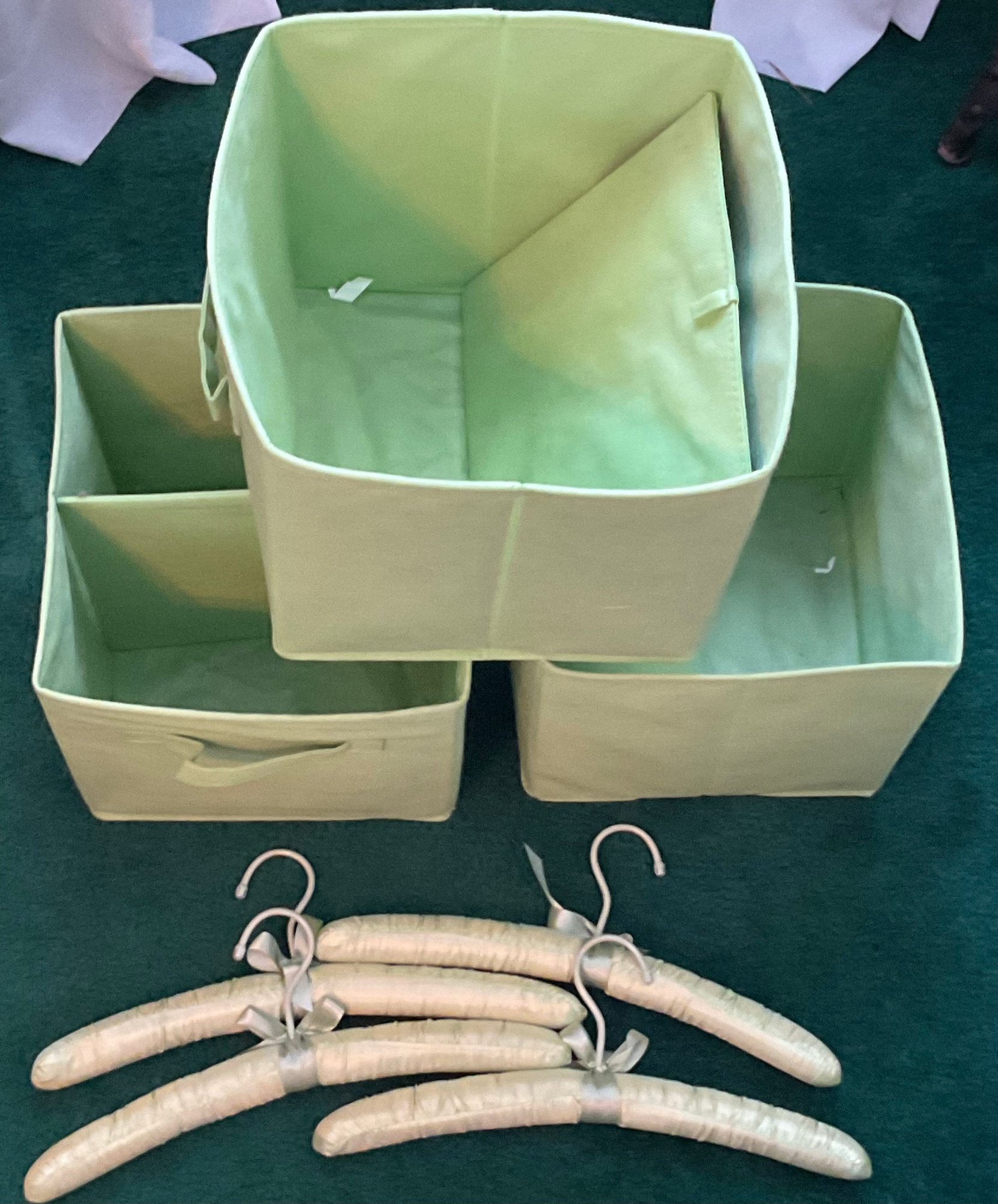 3 Collapsible Storage Boxes & Satin Hangers - boxes 12” x 12” x 12” - good used condition