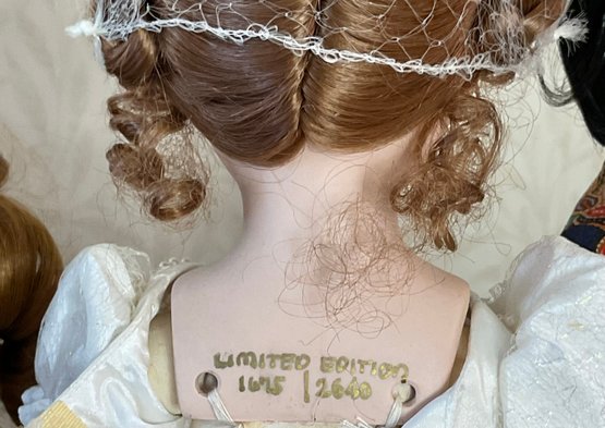 3 Collectible Porcelain Dolls With stands - one limited edition - 12.5” to 15” tall - good used condition