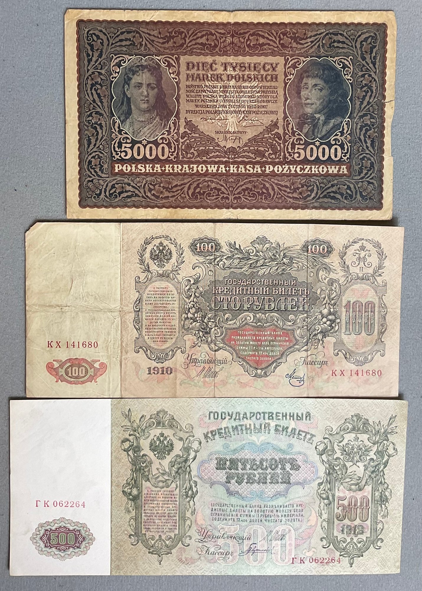 3 Large Antique Foreign Bank Notes - good used condition