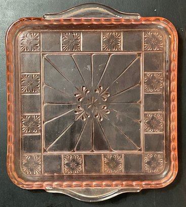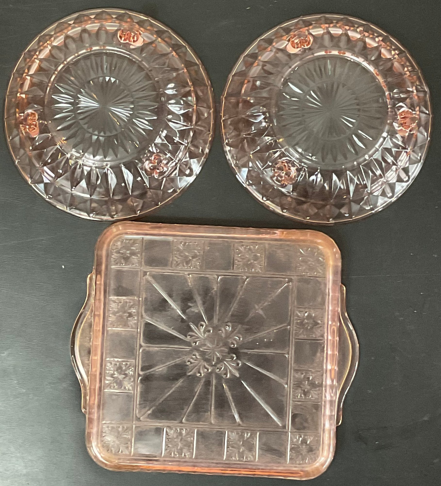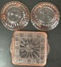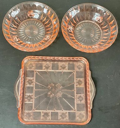 3pc Pink Depression Glass - no chips - square 8 3/8” x 9.75” - bowls 1.75” x 7 3/8” - good used condition