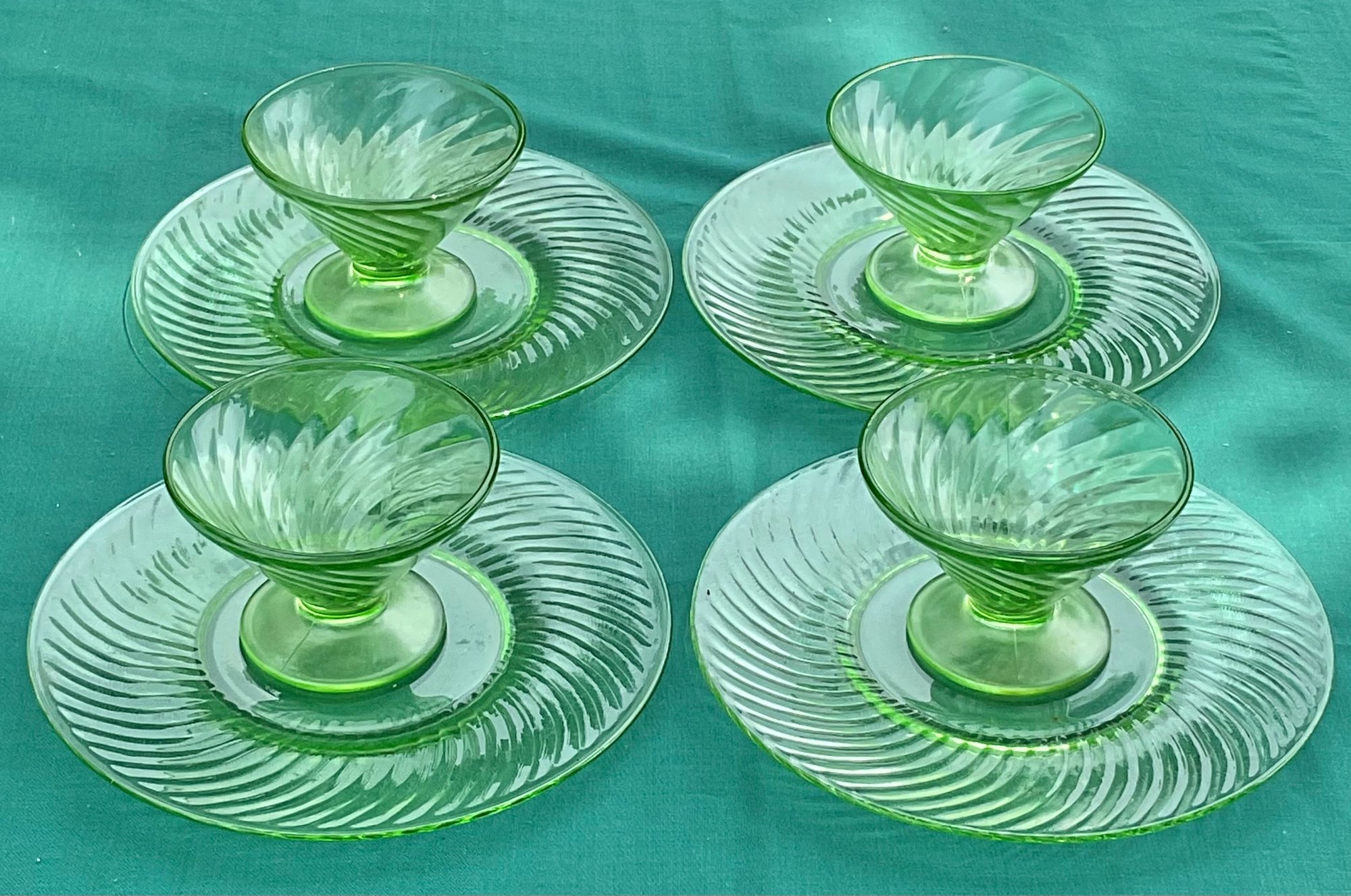 4 Uranium Glass Plates & Sherbet Cups - glows under black light - no chips - plates 8.25” - cups 3” tall x 4 1/8” wide - good used condition
