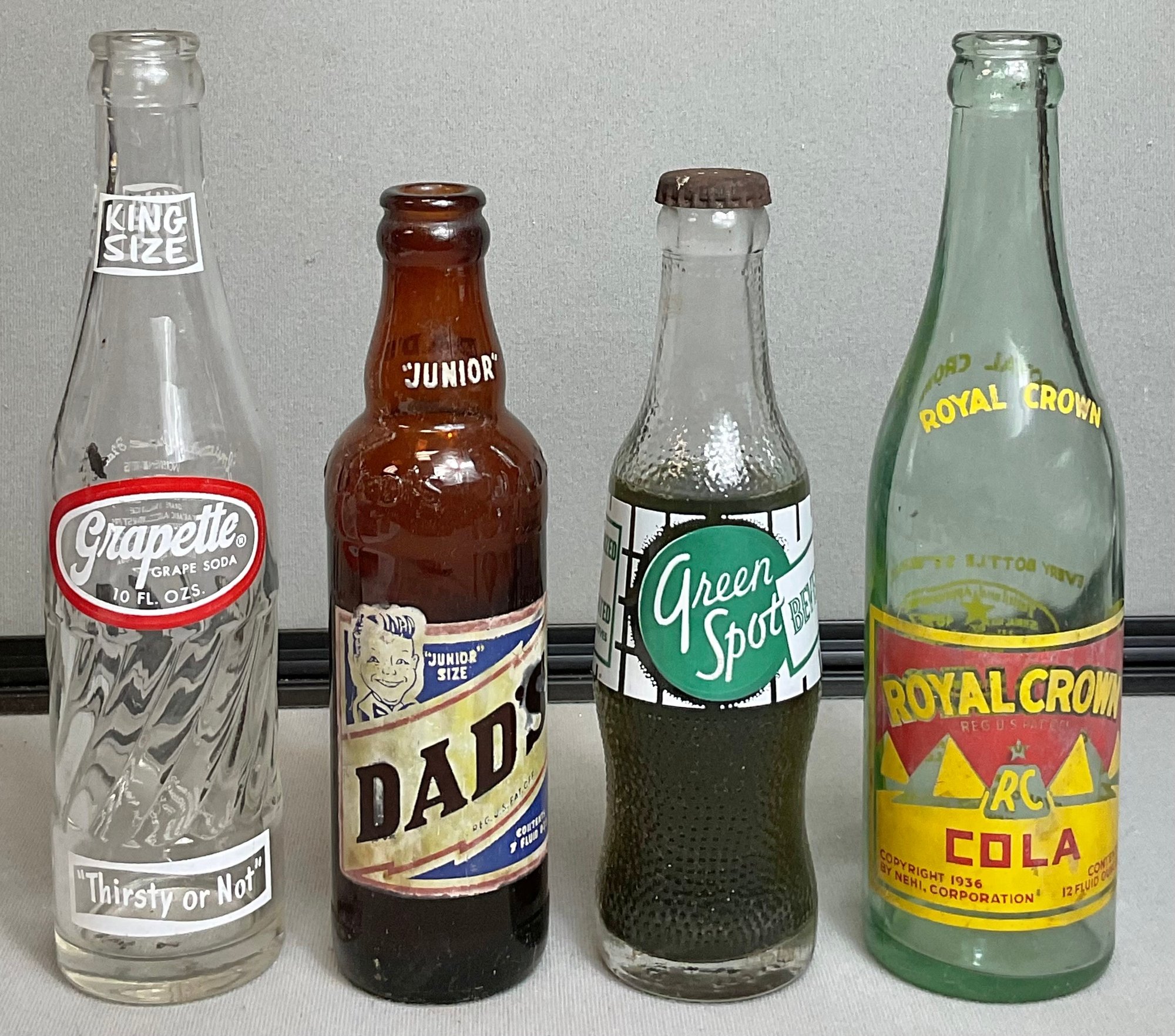 4 Vintage Soda Bottles - Green Spot has contents - no chips - 8” to 9.5” tall - good used condition
