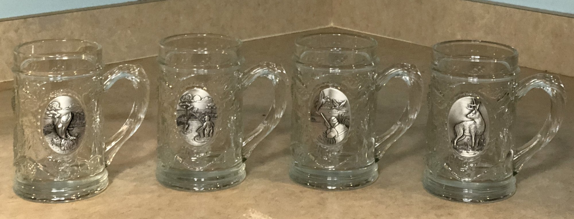 4pc Glass Mugs W/ Pewter Fishing/ Hunting Medallions - 5 1/8" tall - good used condition -