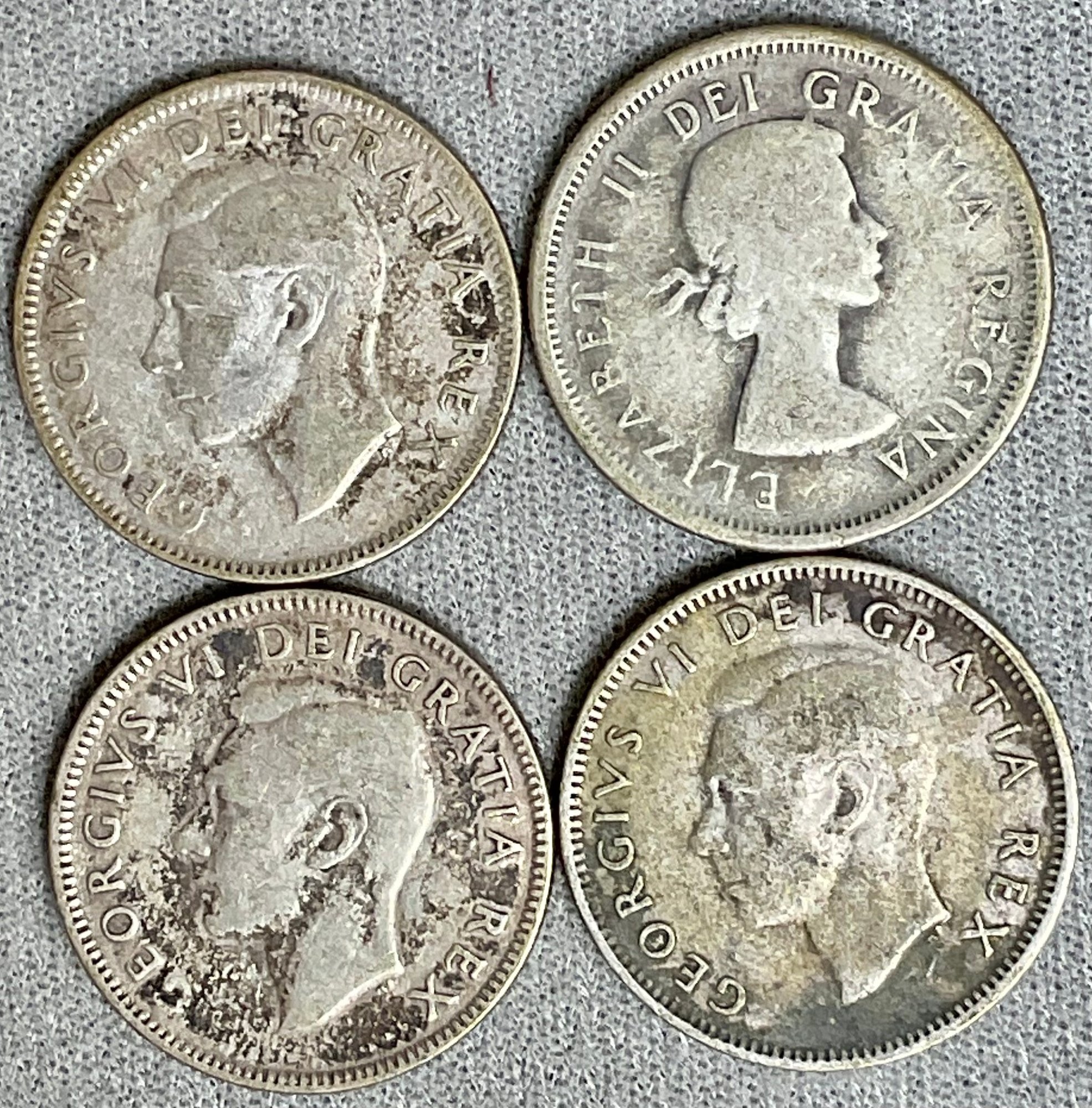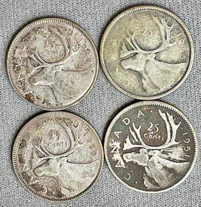 4pc Silver Canadian Quarters - 80% silver - 1949-55 - good used condition