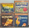 4pc Vintage Fruit Crate Labels On Wood - 2 are 11.5” x 11.5” - 1 is 11.5” x 10.5” - 1 is 11.5” x 8.5” - good used condition
