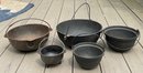 5 Cast Iron Cooking Pots - smallest 3” tall x 5” wide - largest 4.5” tall x 11.25” wide - no cracks or holes - good used condition