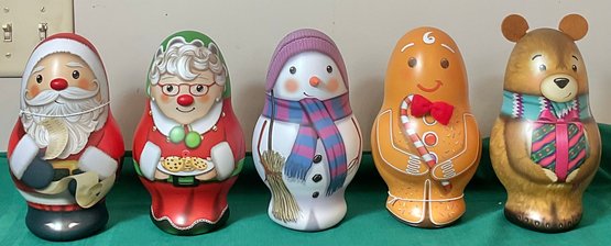 5 Russel Stover Christmas Figure Tins - empty - 9.5” tall - great condition