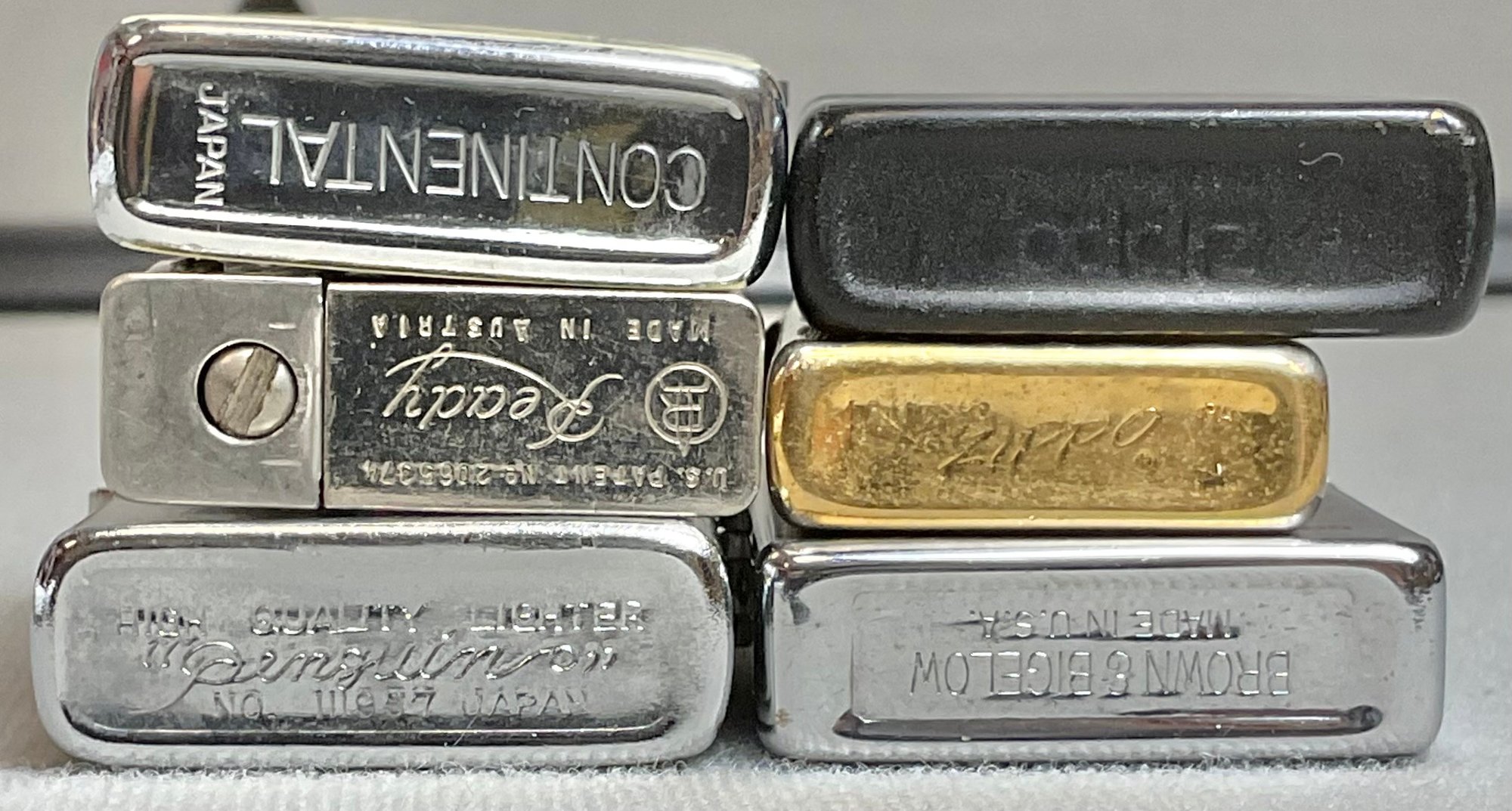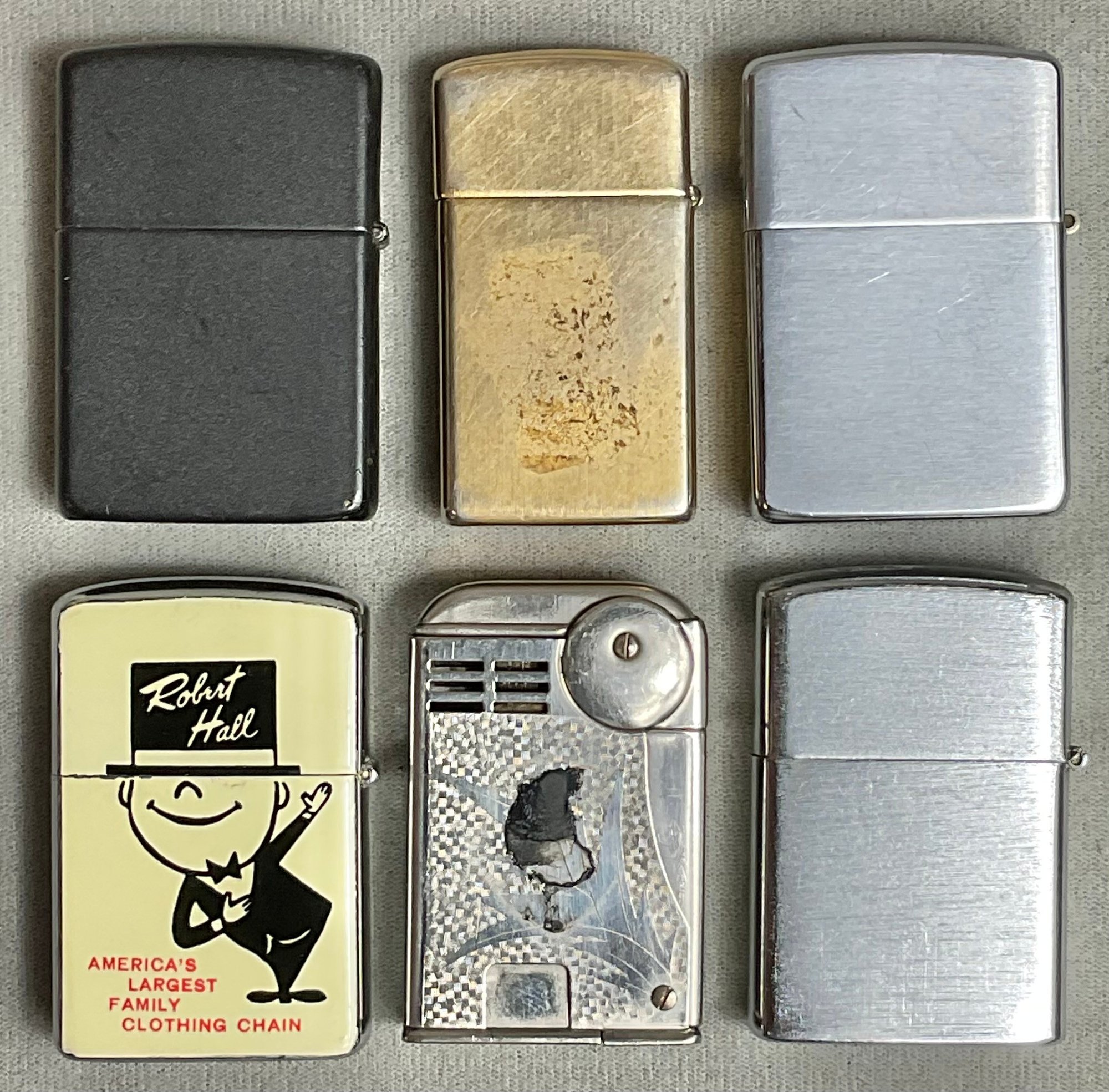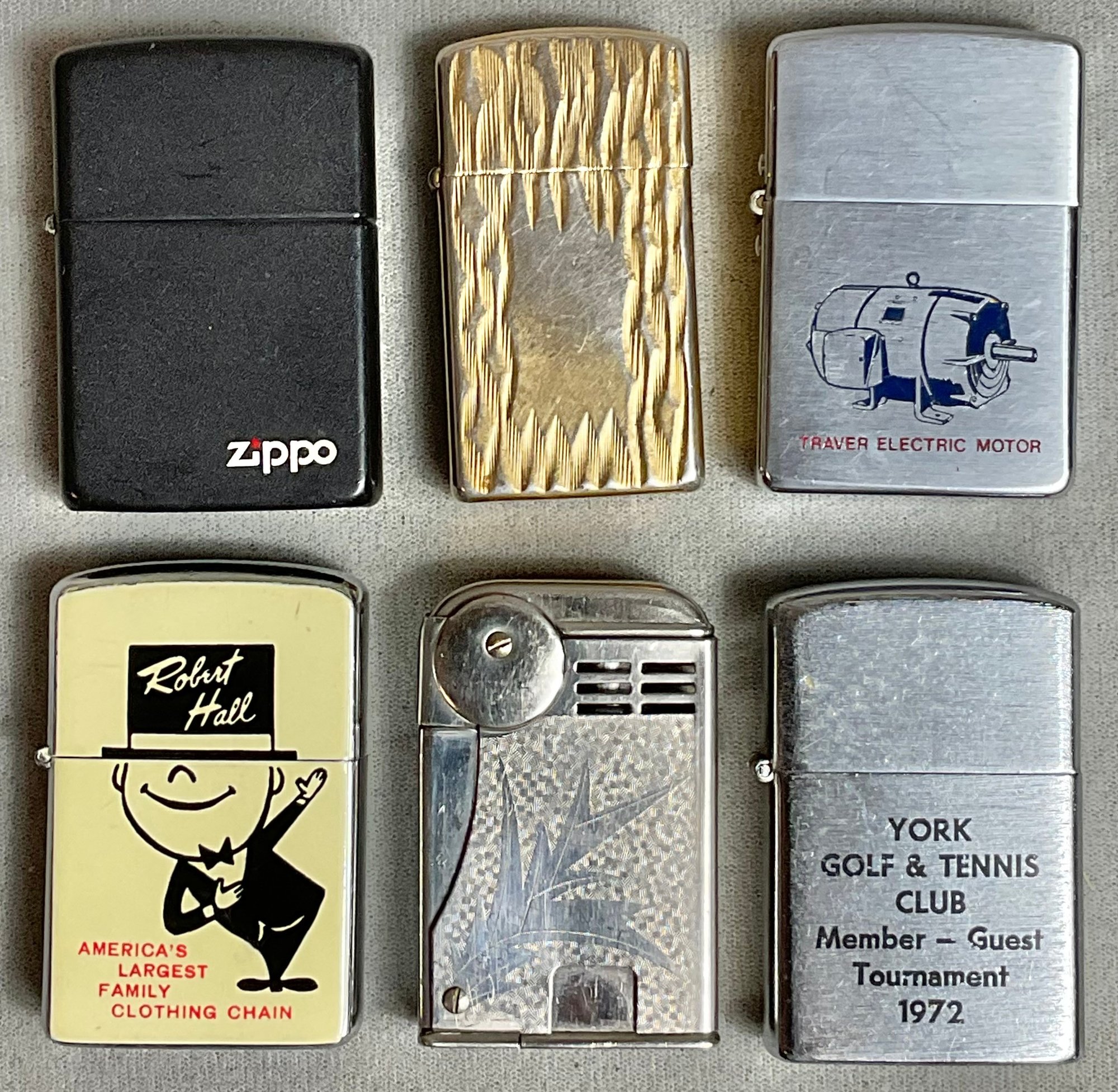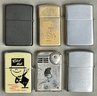 6 Vintage Lighters - Advertising/Zippo - as found in drawer - 2 are Zippo - need fluid & some need flint - good used condition