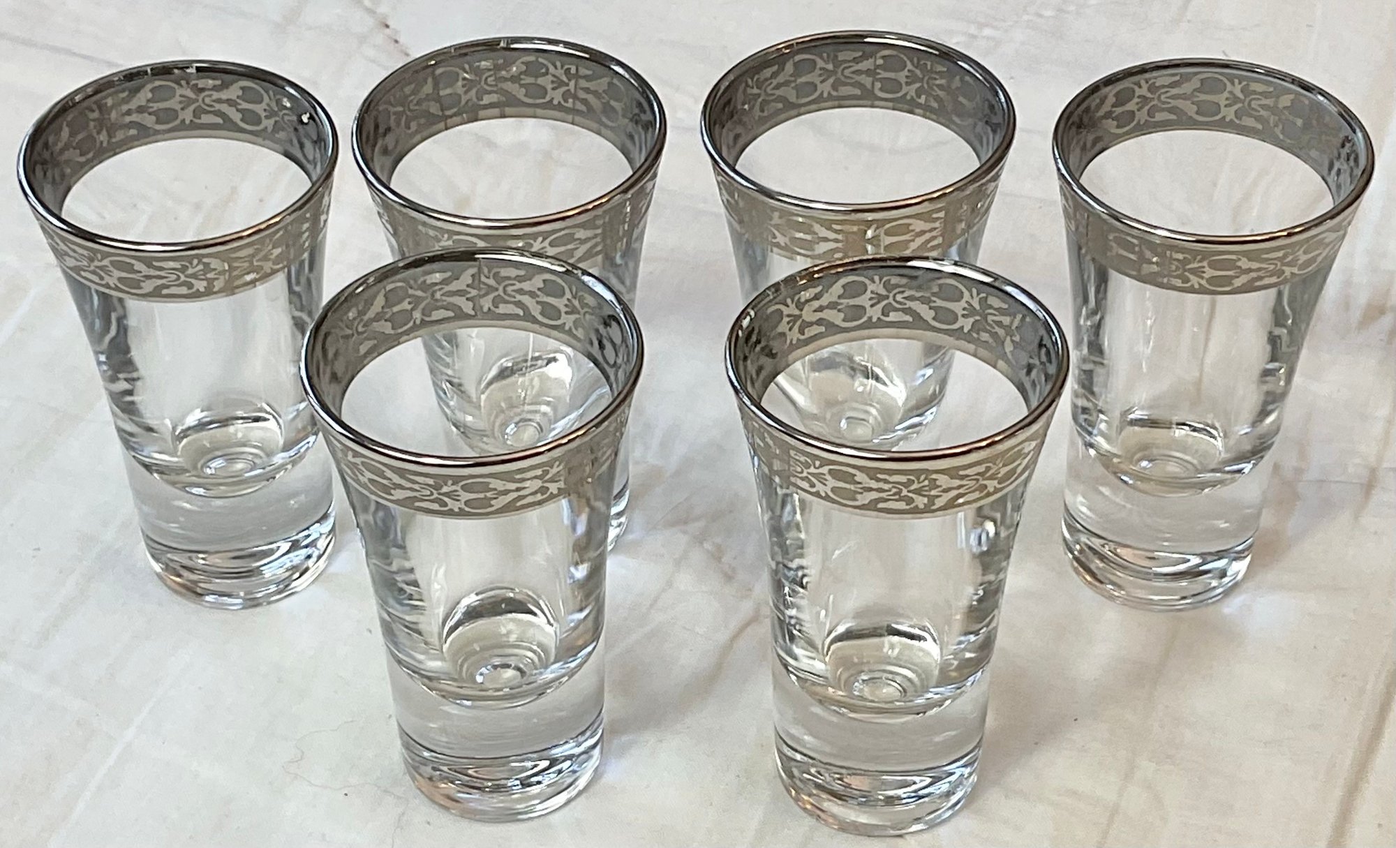 6 Vintage Silver Rimmed Shot Glasses - no chips - 3.5” tall - good used condition