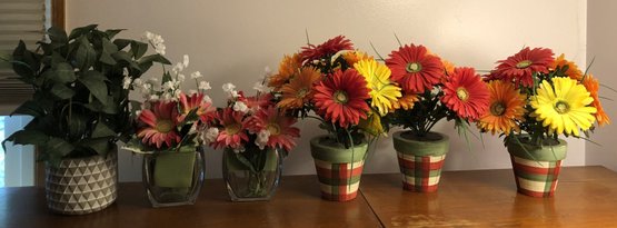 6pc Faux Flowers & Pots - 3 plaid are foam - 2 glass - 1 ceramic - 9" to 14" tall - good used condition -
