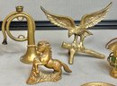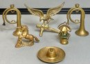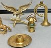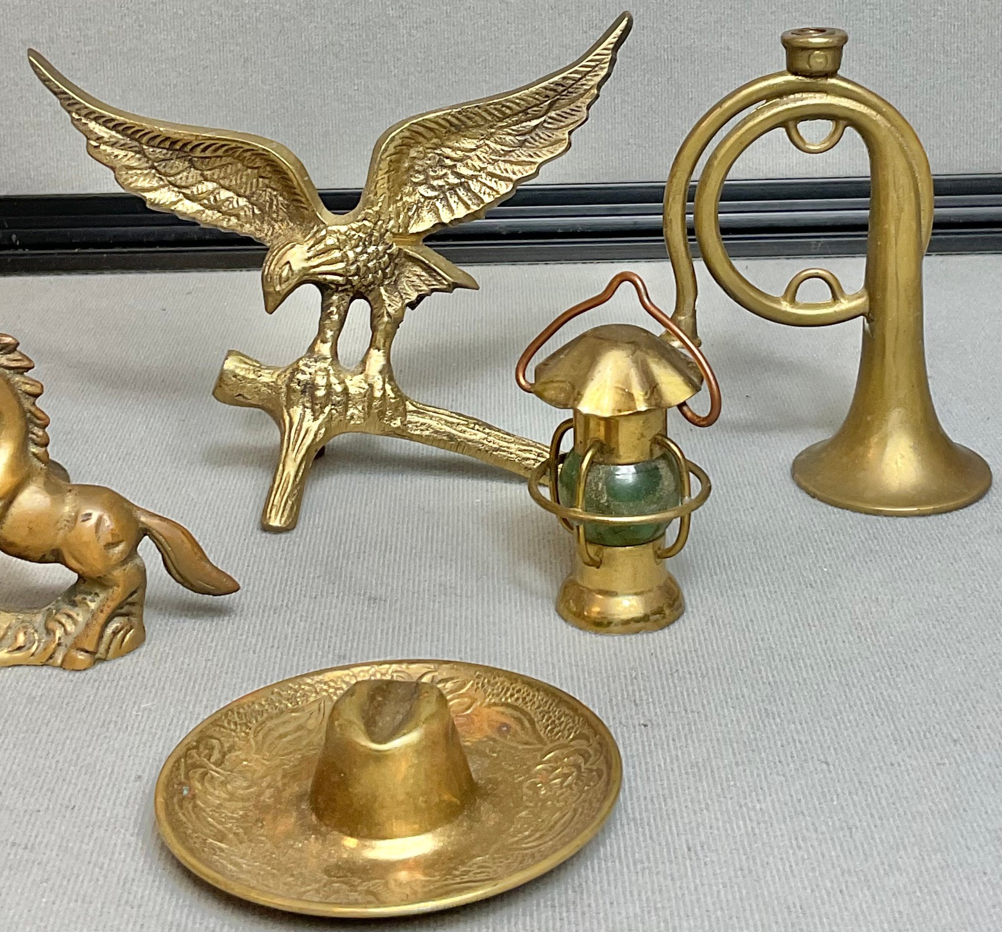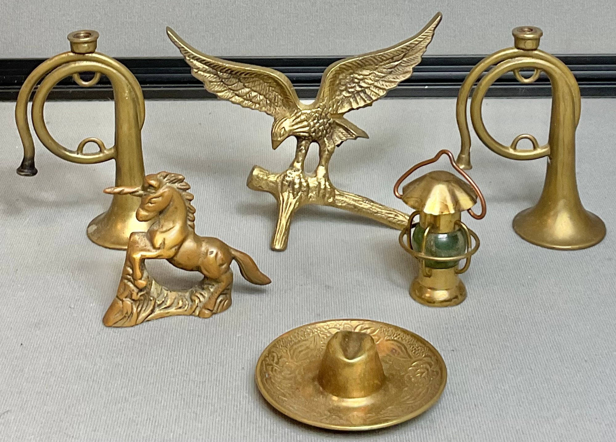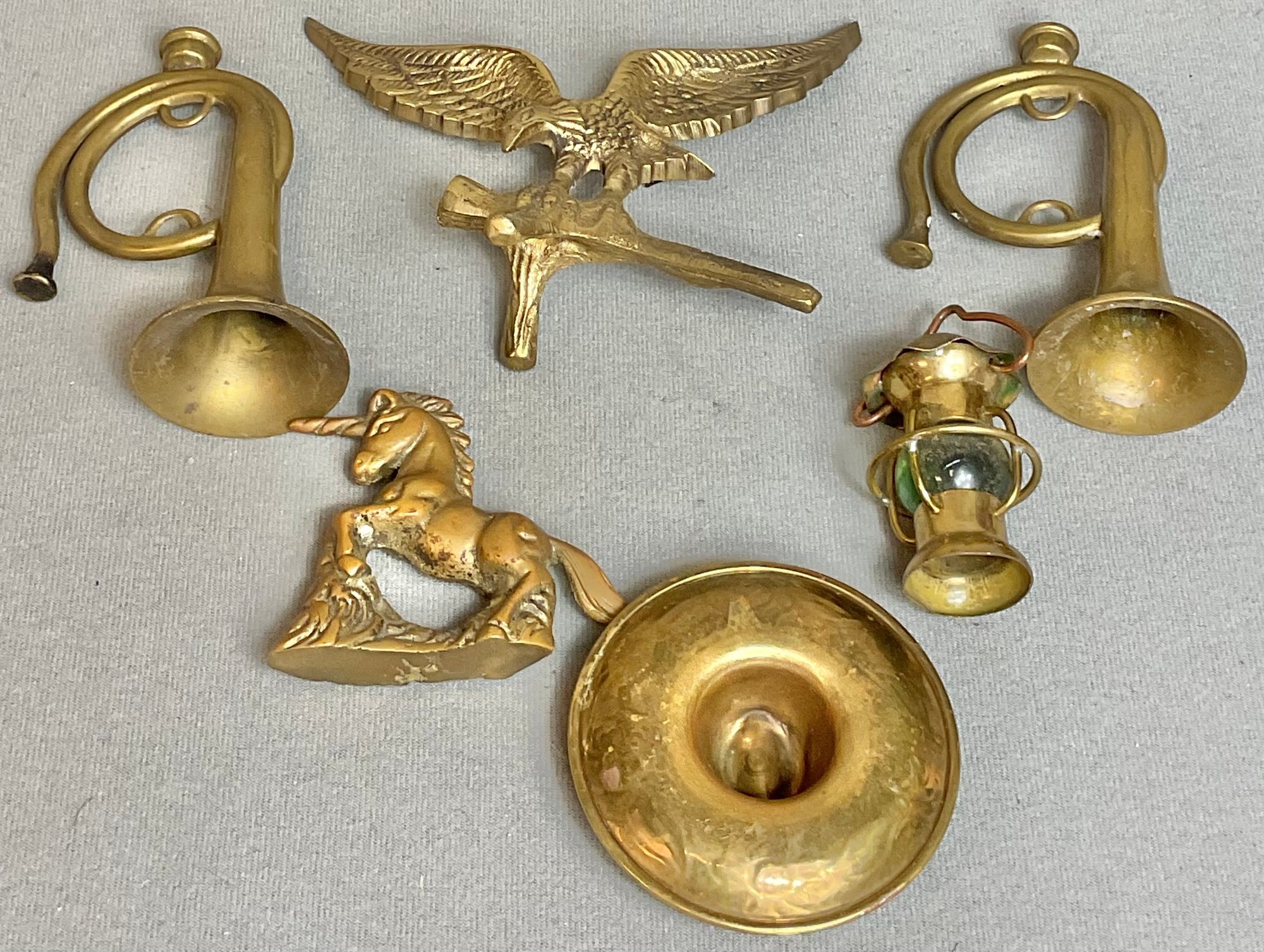 6pc Solid Brass Decorations - French horns, eagle, unicorn, hat ashtray, lantern - 1” to 4 1/8” tall - good used condition