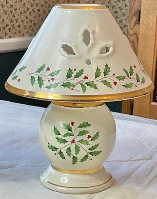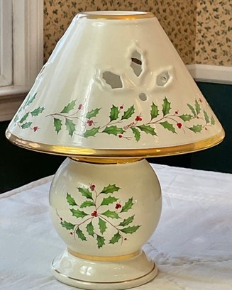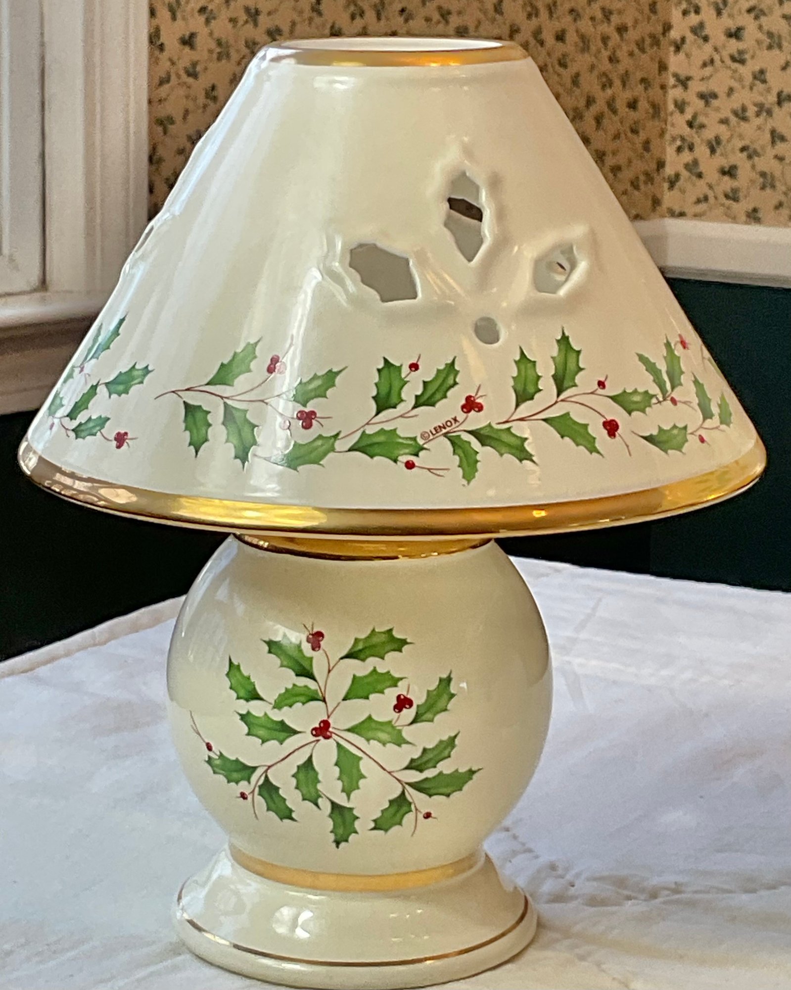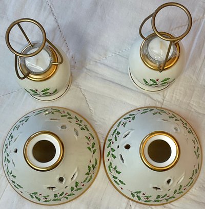 Pair Lenox Holly Holiday Tea Lamps - no chips - 8” tall - good used condition
