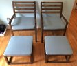Pair Wood Slat Chairs & Ottomans - chairs 35" tall x 24" wide x 22.5" deep - ottomans 13.5" tall x 19" wide x 20" - has light blue cushions - good used condition -