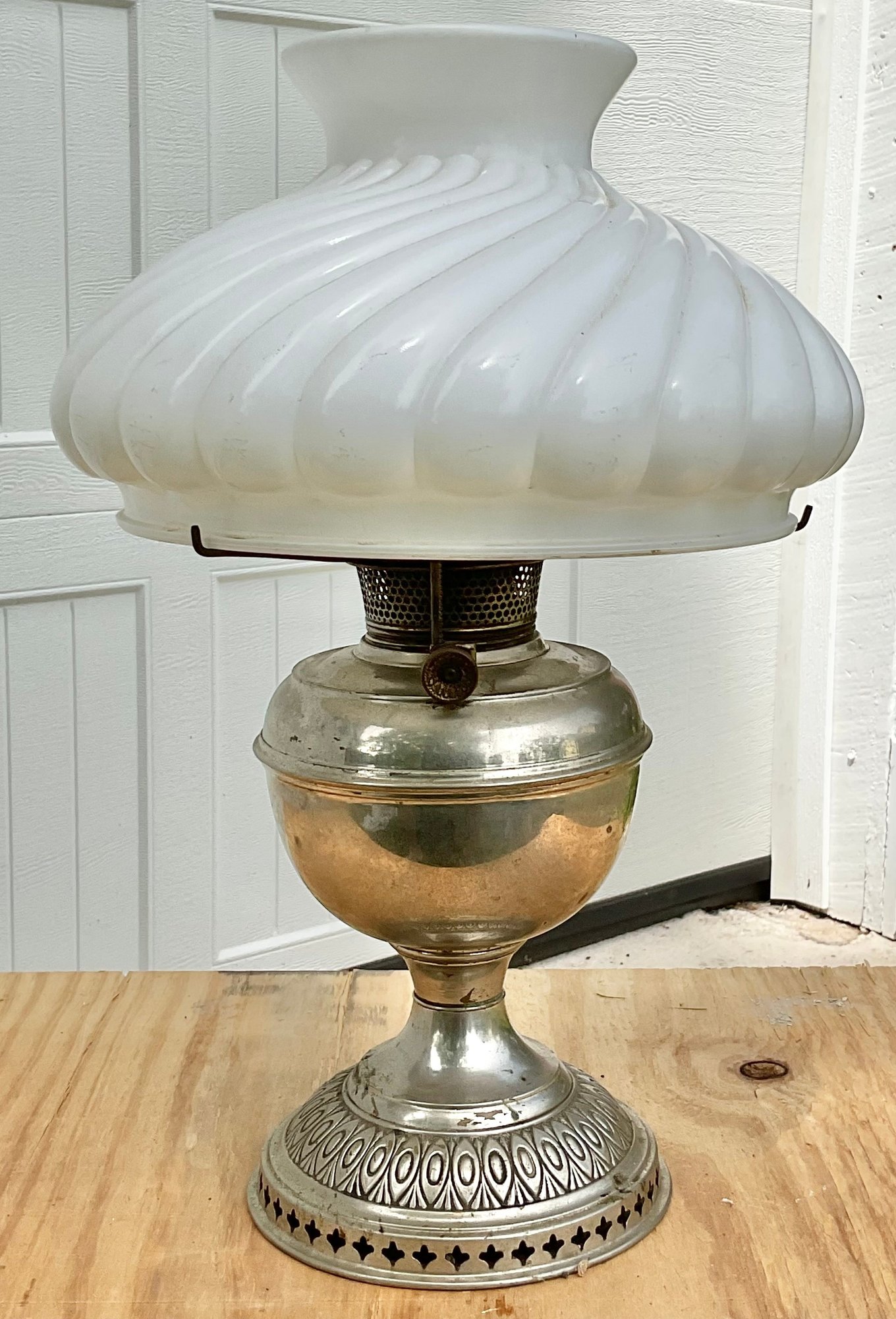 Antique Bradley & Hubbard Oil Lamp W/ Milk Glass Shade - 17.5” tall - shade 11” wide - good used condition
