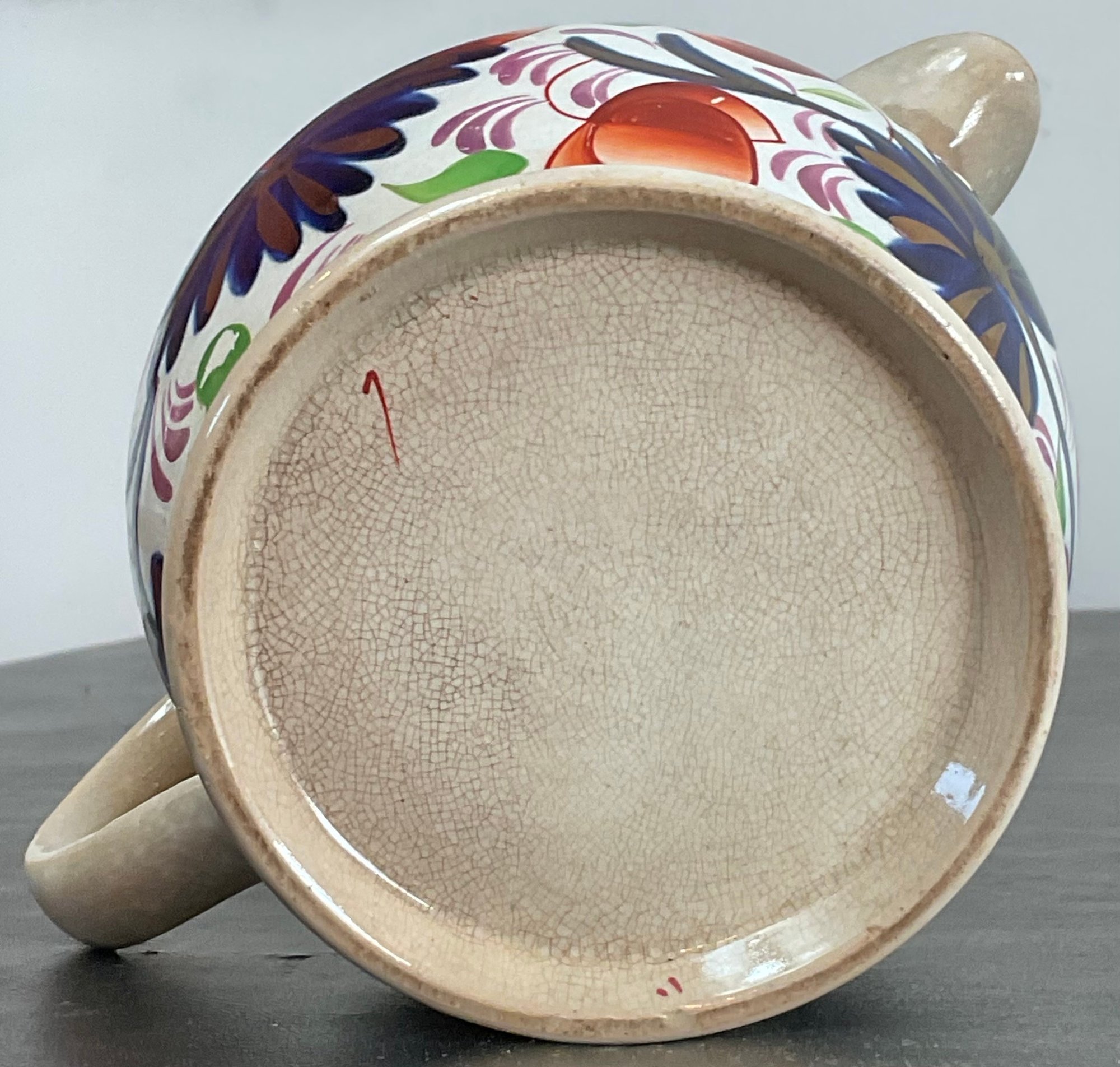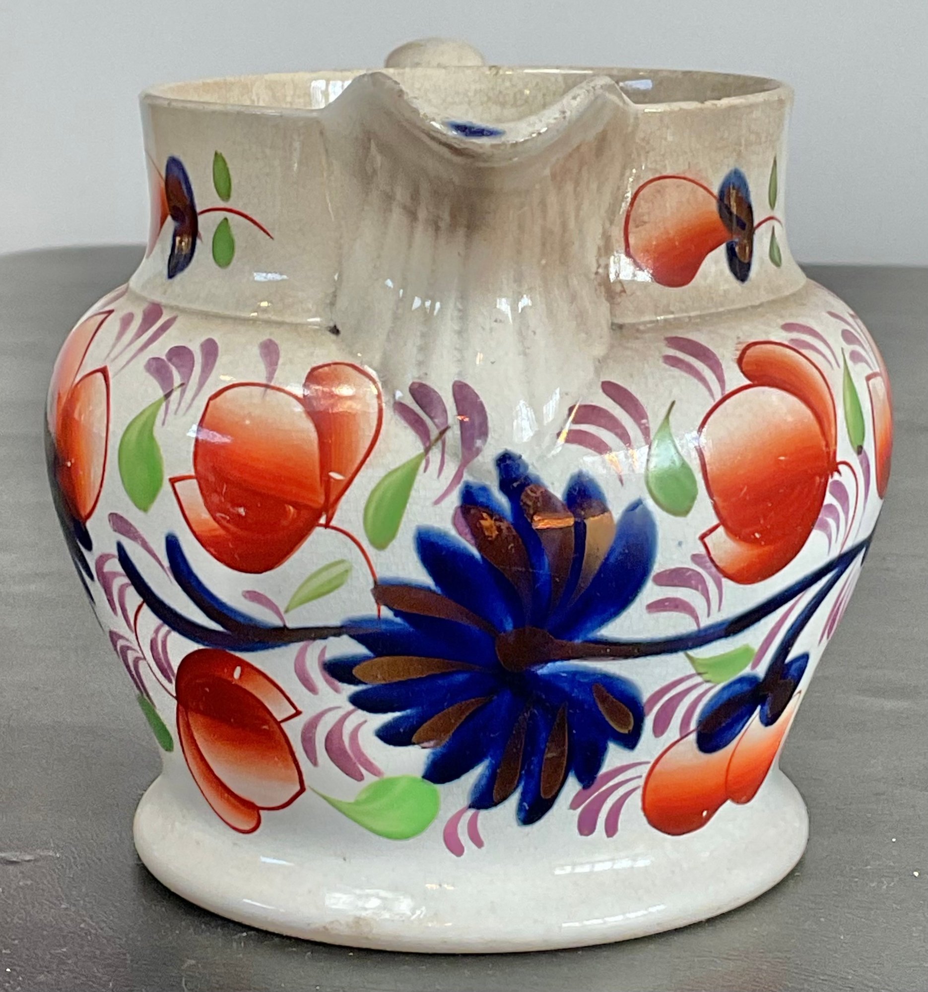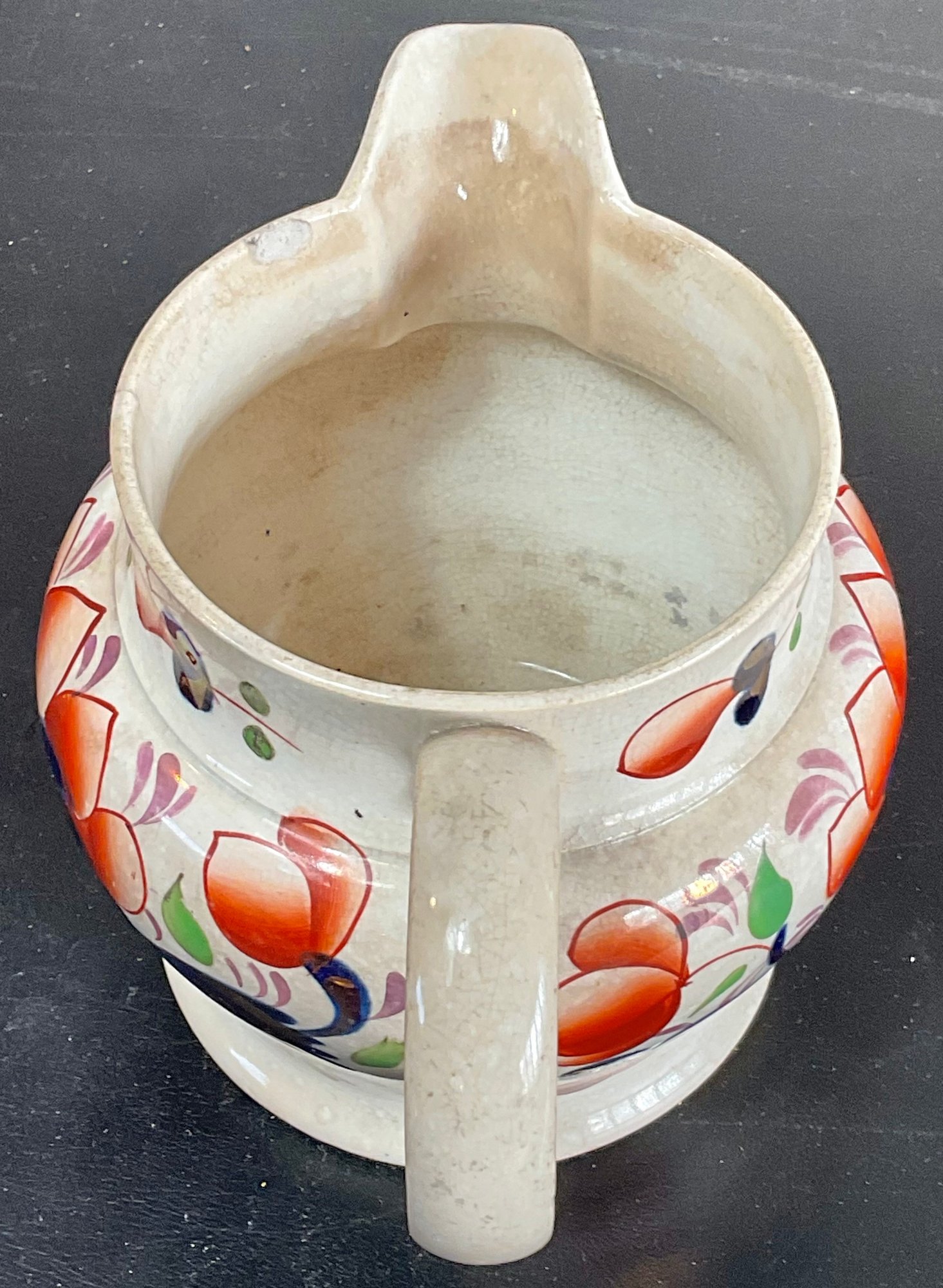 Antique Gaudy Welsh Pottery Jug - small chip & crack - 4.5” tall x 6.75” long x 4 5/8” wide - good condition for age