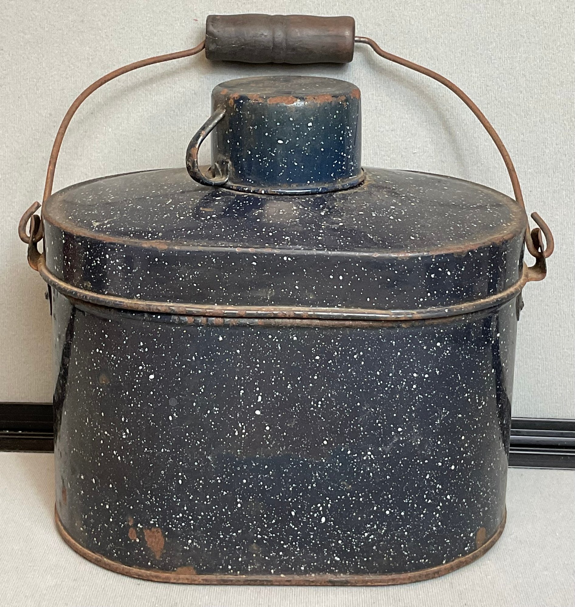 Antique Graniteware Miners Lunch Pail - 9.5” tall x 10.5” long x 6” wide - has inserts - good used condition
