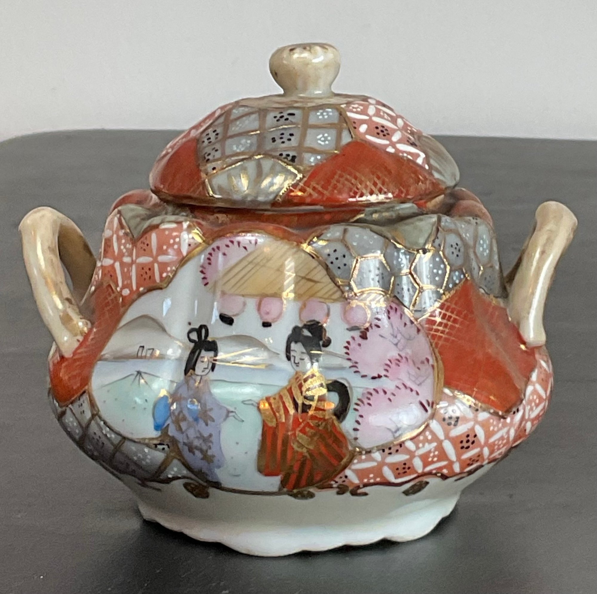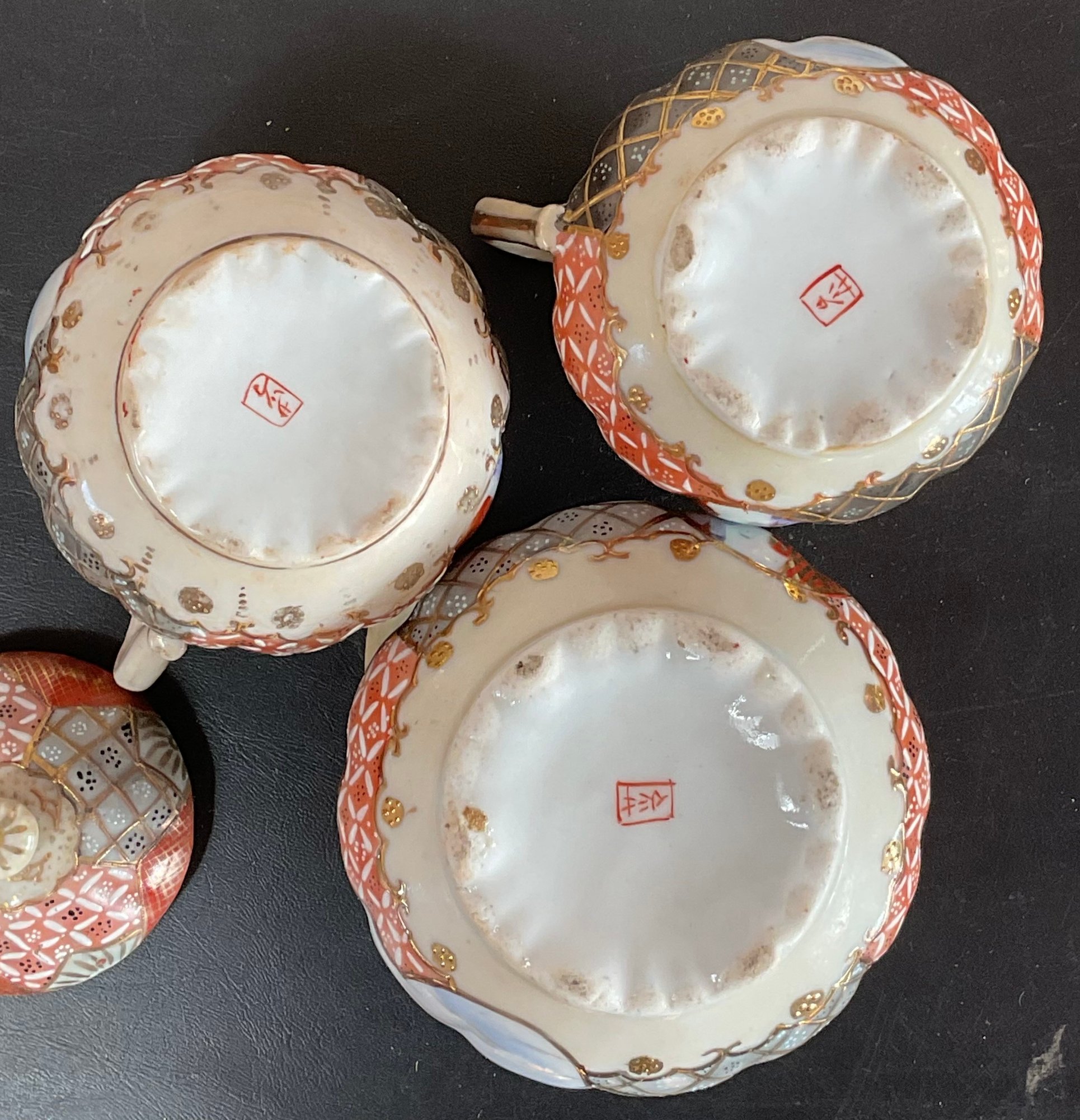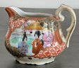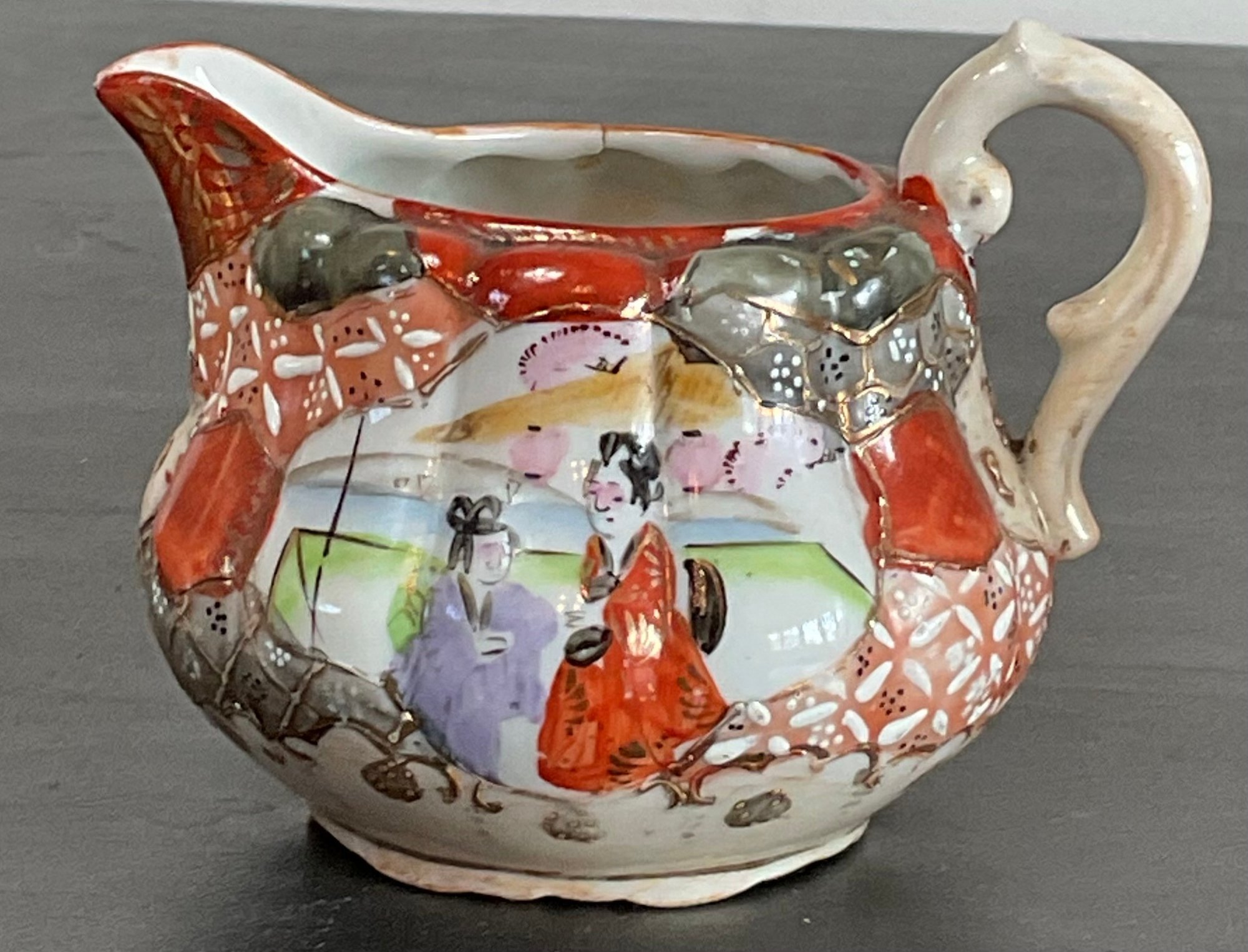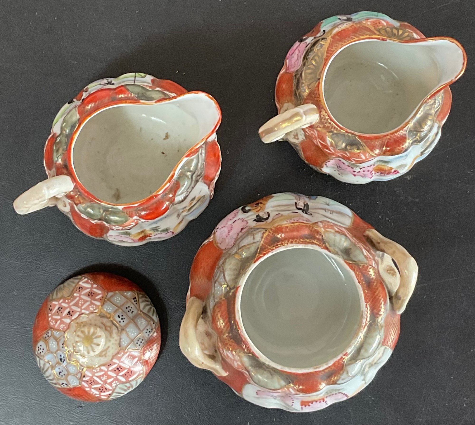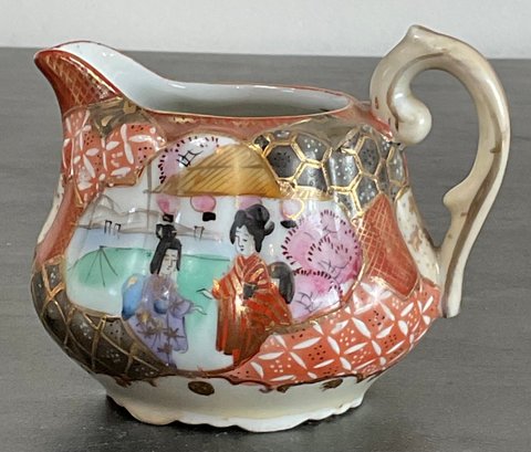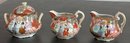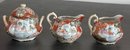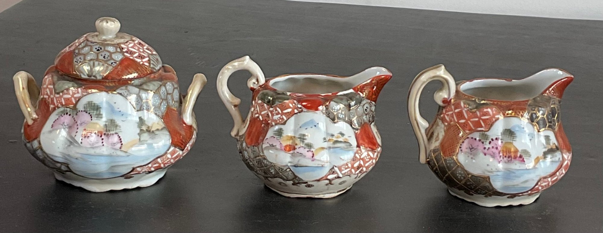 Antique Japanese Kutani Porcelain Sugar Bowl & 2 Creamers - one creamer has manufacturing crack — 3.25” to 4.5” tall - good used condition