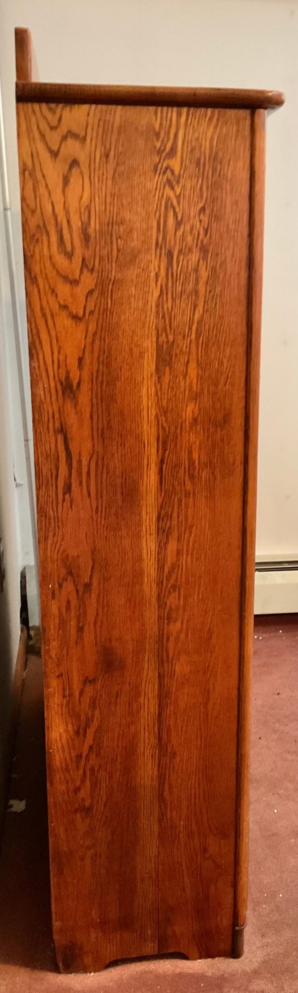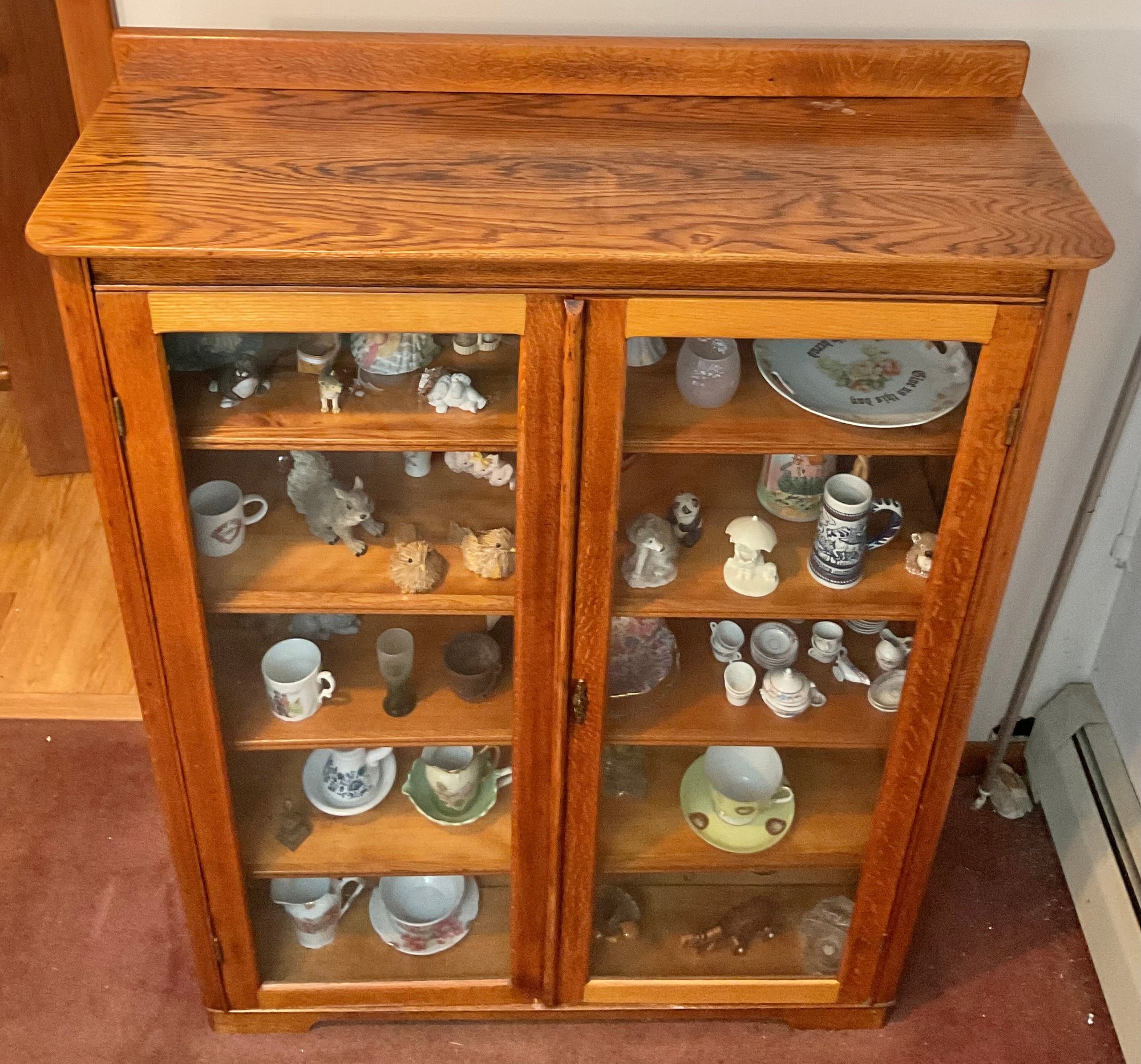 Antique Oak Two Door Curio Cabinet W/ Key - contents not included (previous lot) - 55” tall x 39.5” long x 13 3/8” wide - good used condition