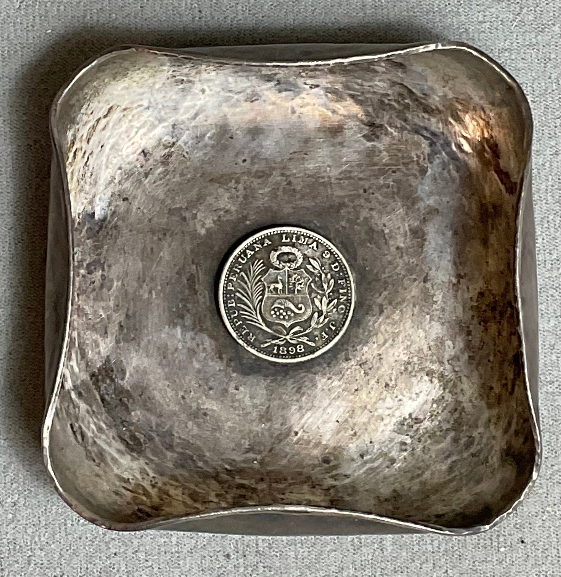 Antique Peruvian Coin Sterling Silver Ashtray - .75” tall x 3 1/8” long x 3 1/8” wide - weighs 41.5 grams - good used condition