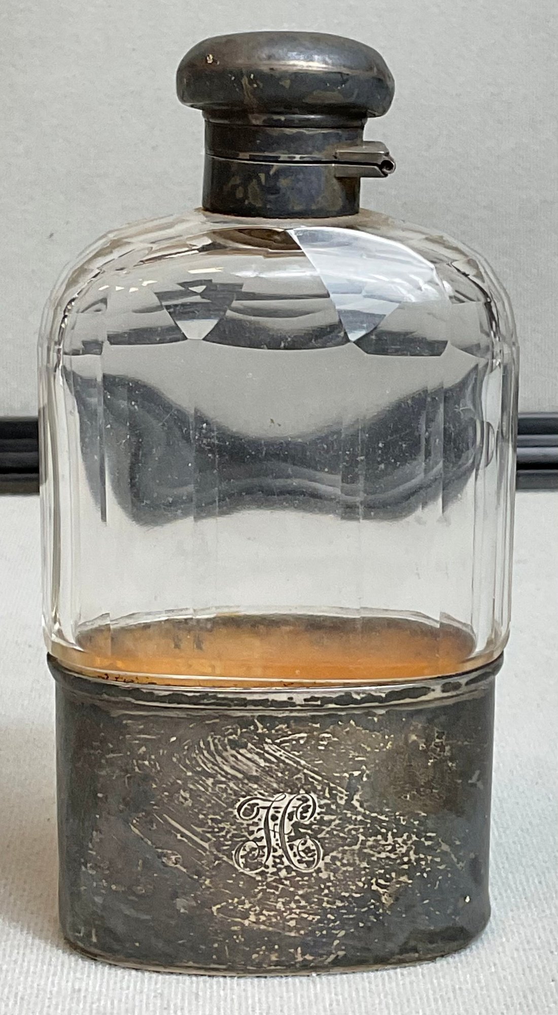 Antique Sterling & Glass Hip Flask - 6” tall x 3” long x 1.5” wide - top dented but still closes fine - bottom cup weighs 55.8 grams - good used condition