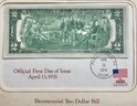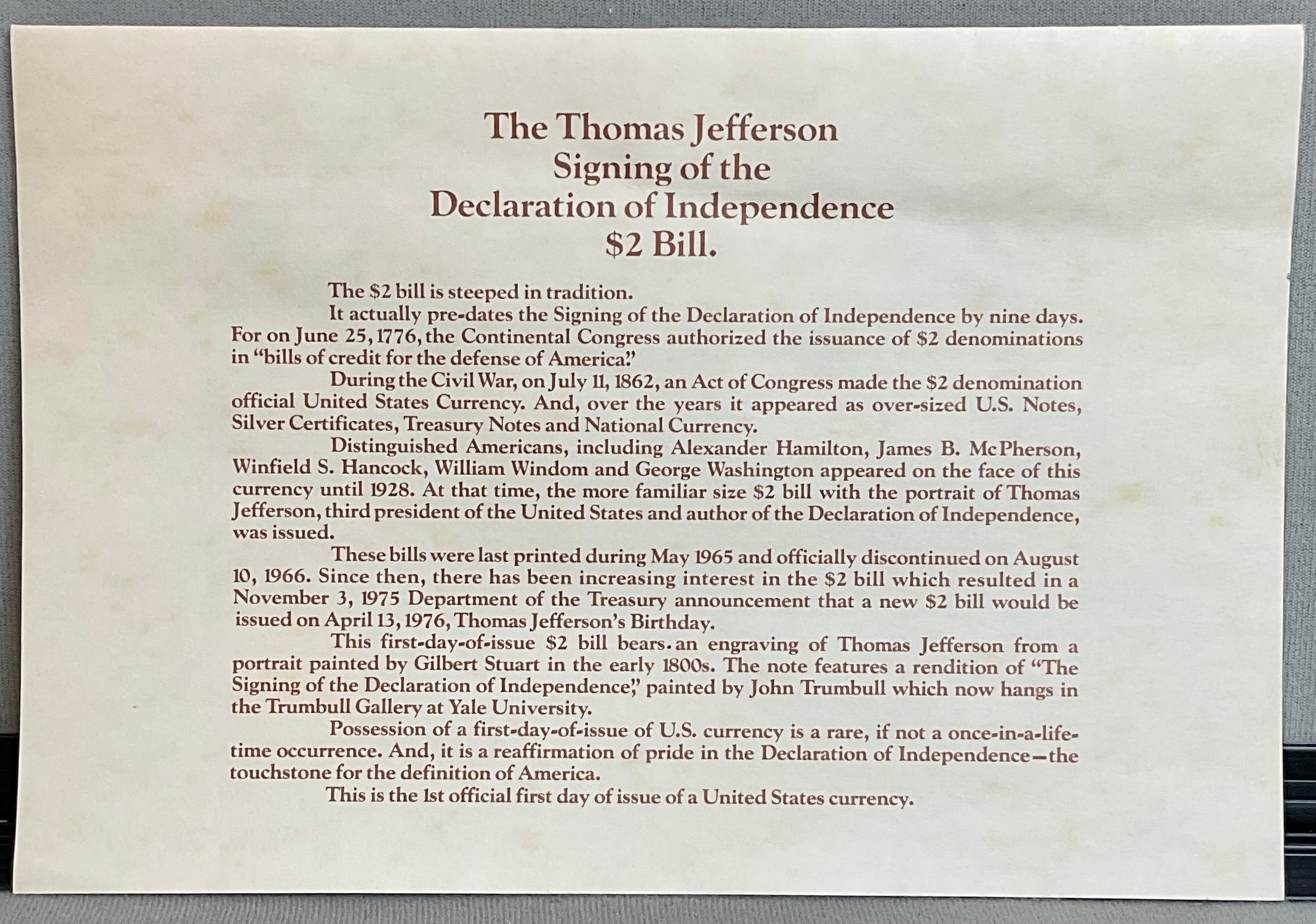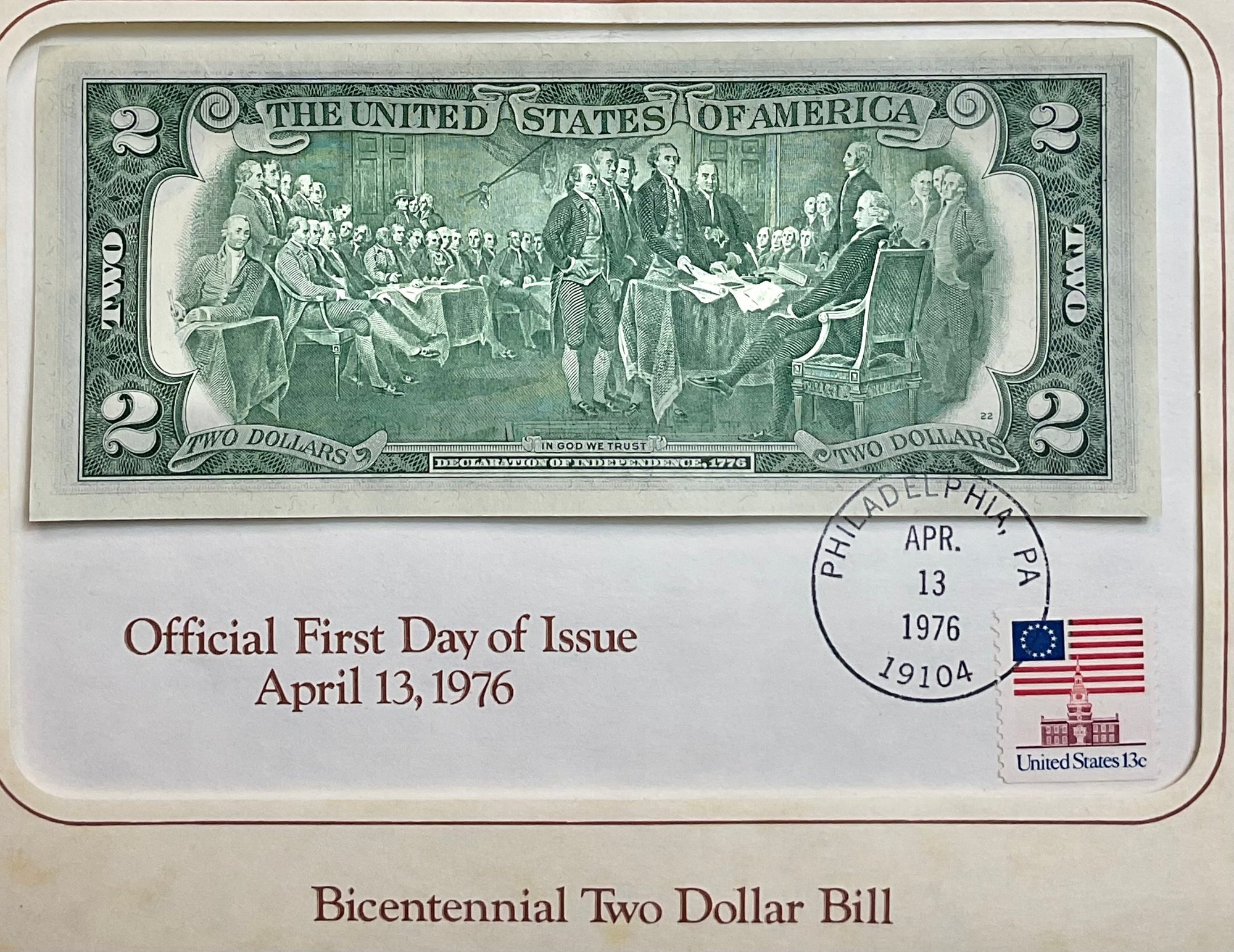 April 13, 1976 Official First Day Issue Bicentennial Two Dollar Bill - Thomas Jefferson signing Declaration of Independence - good used condition
