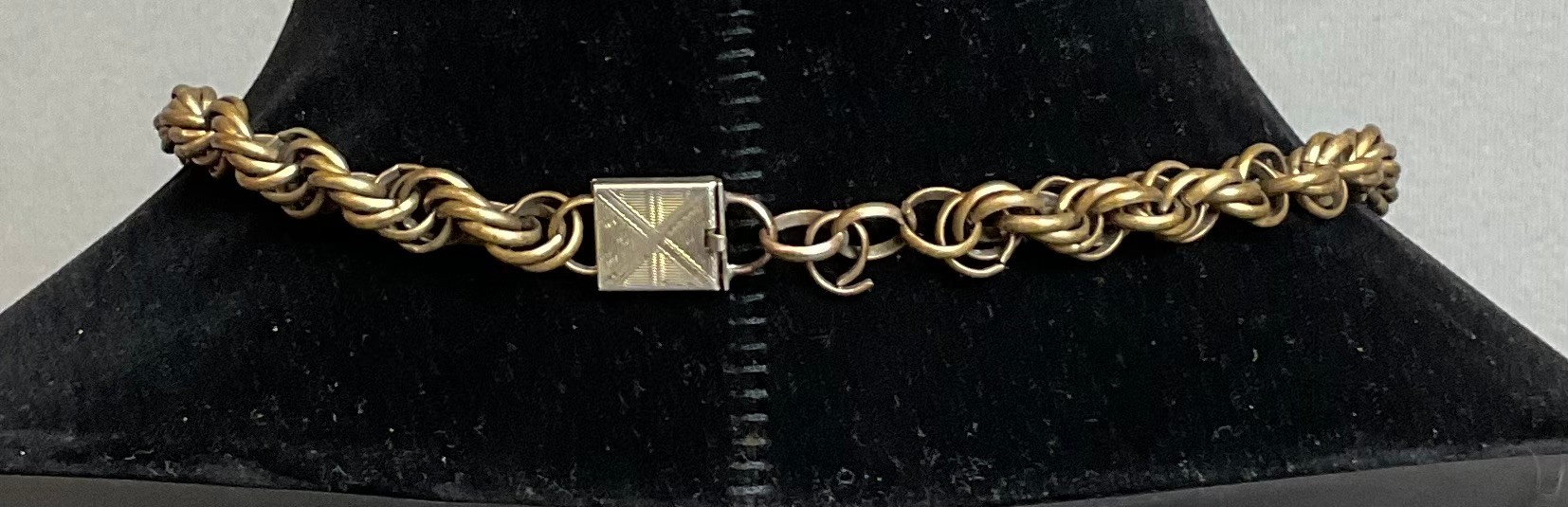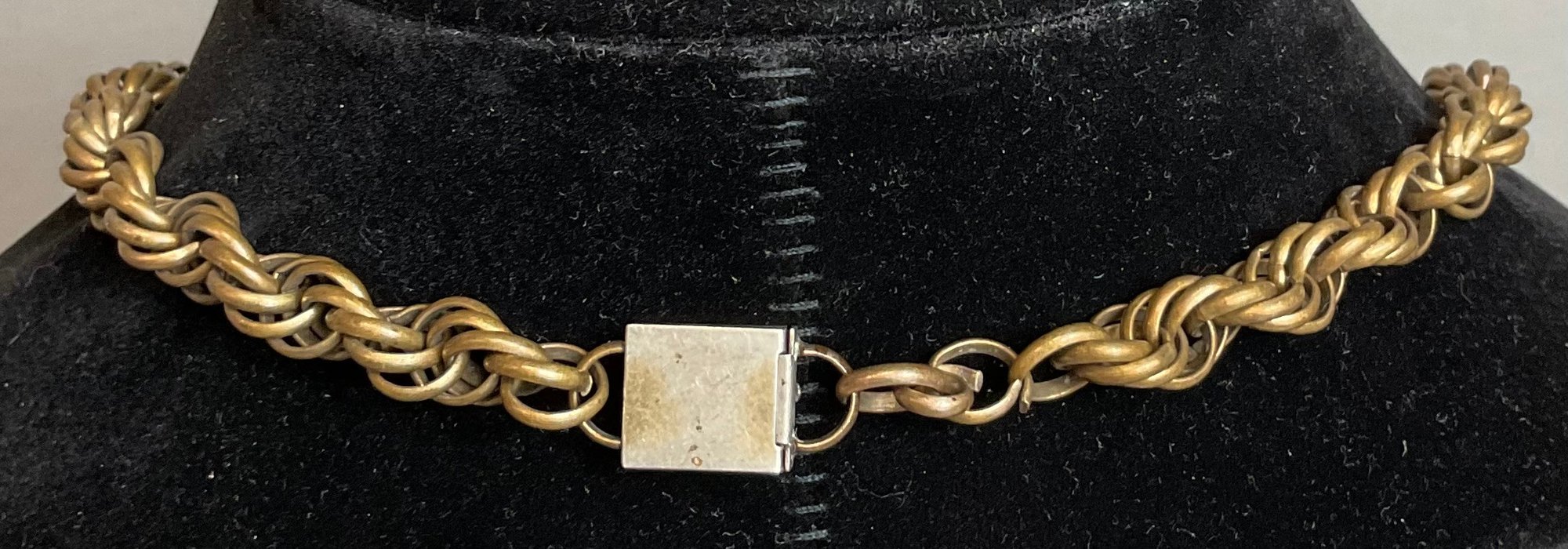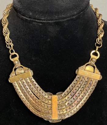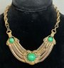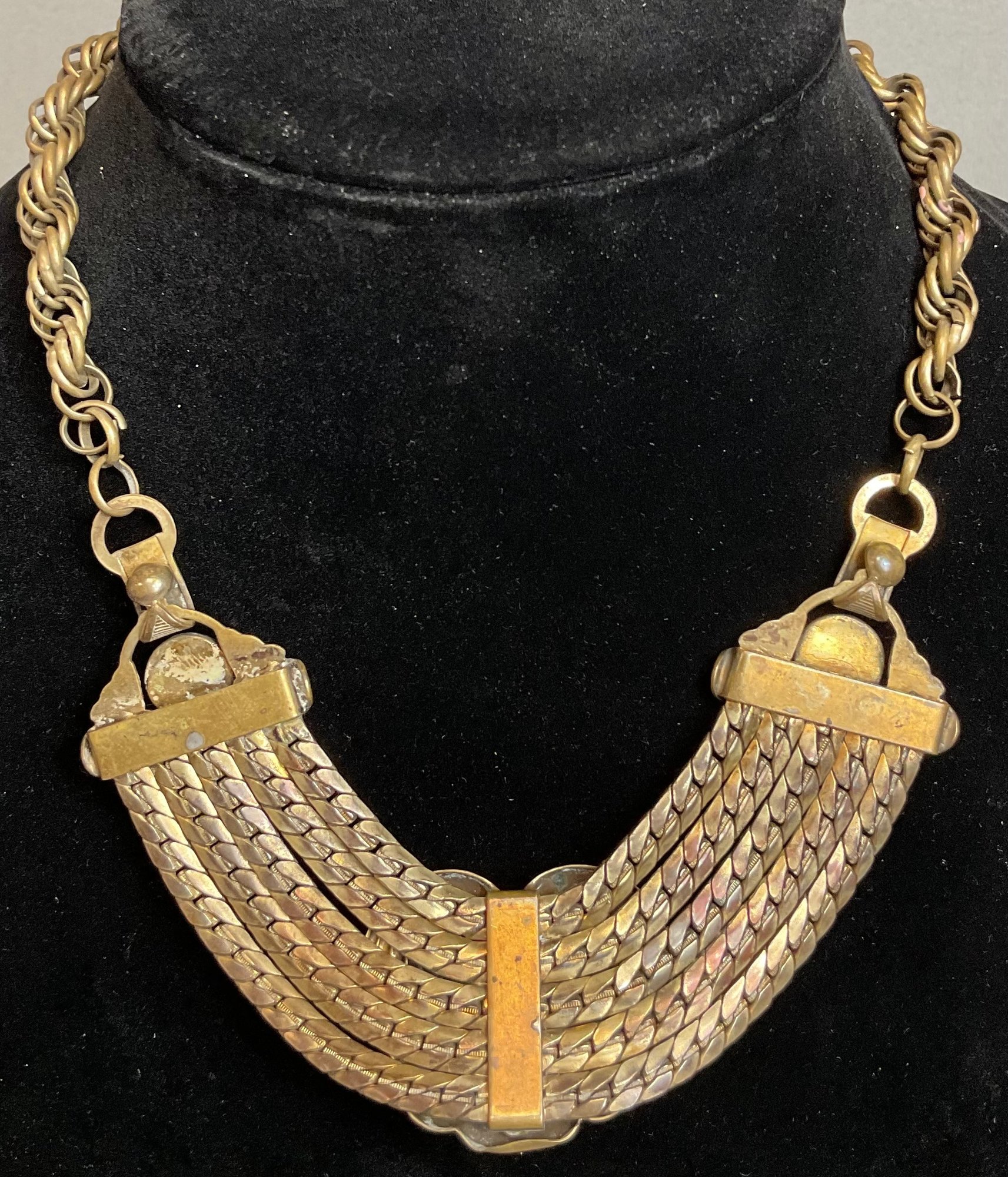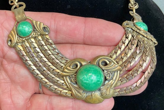 Art Deco Egyptian Revival Peking Glass Statement Necklace - brass - most likely Czech. - unsigned - 16” long - looks like it was extended by thinning links - great piece - good used condition