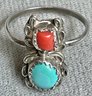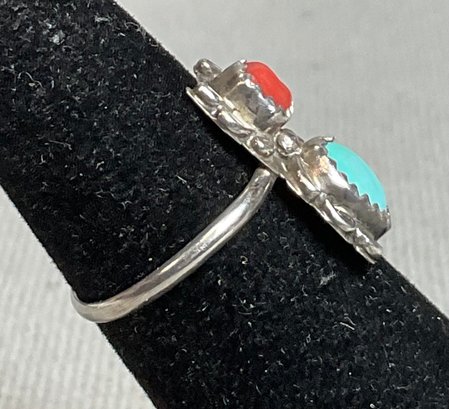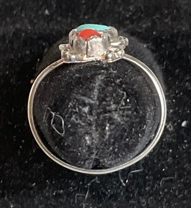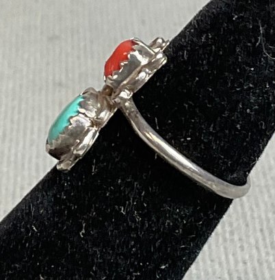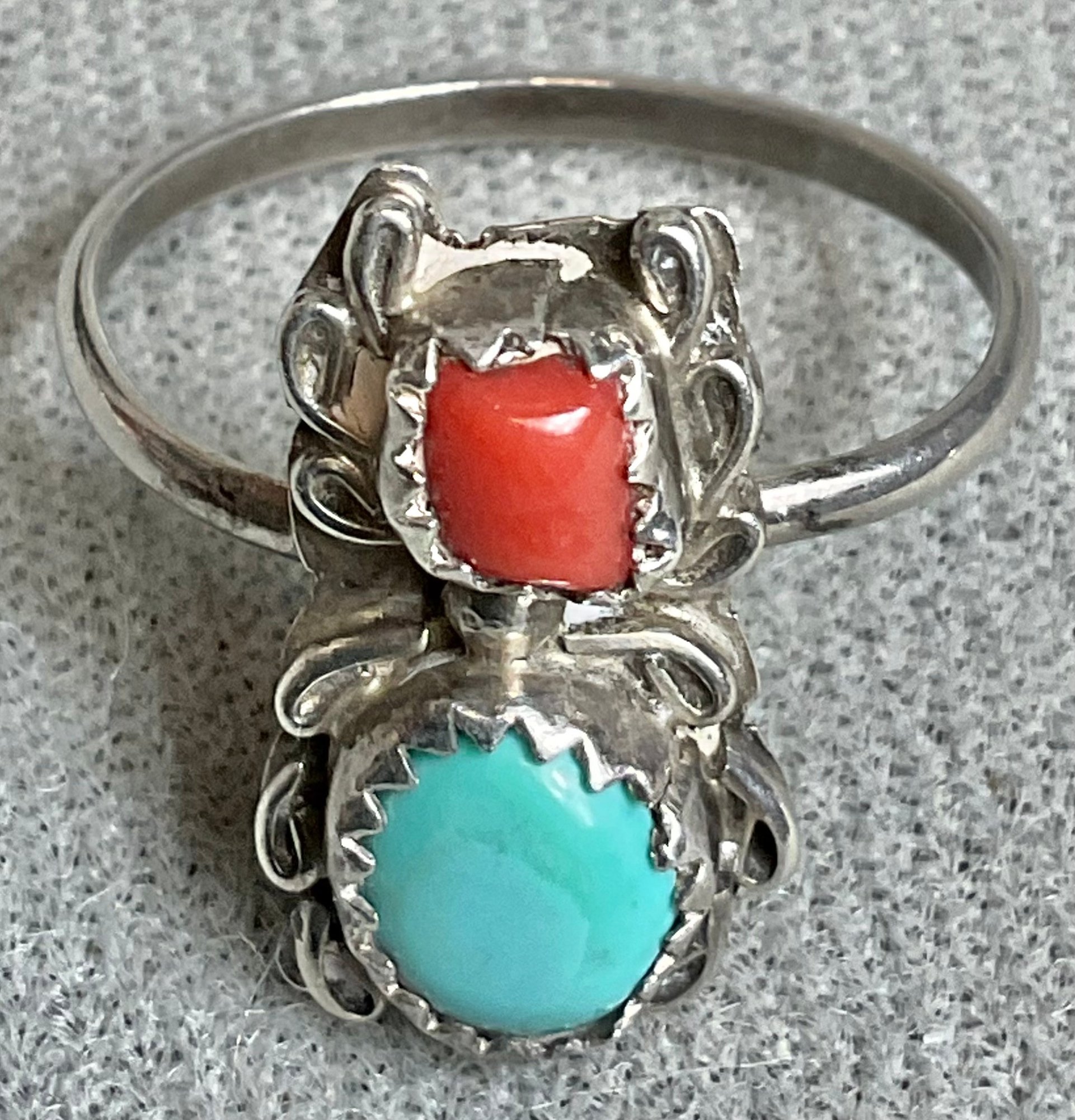 Navajo Sterling Turquoise & Coral Ring - unmarked and unsigned - XRF tested sterling - size 5.5 - weighs 1.8 grams - good used condition
