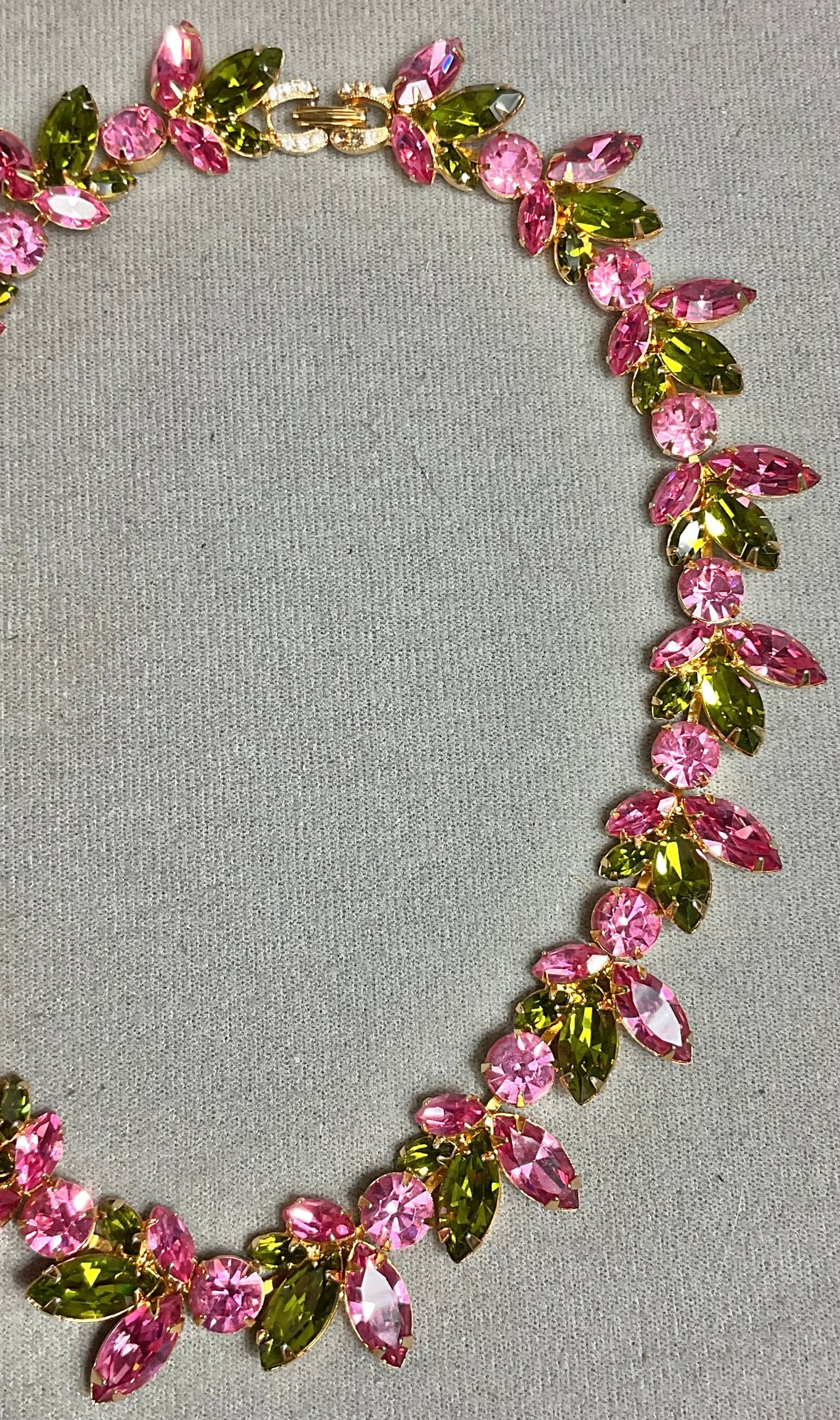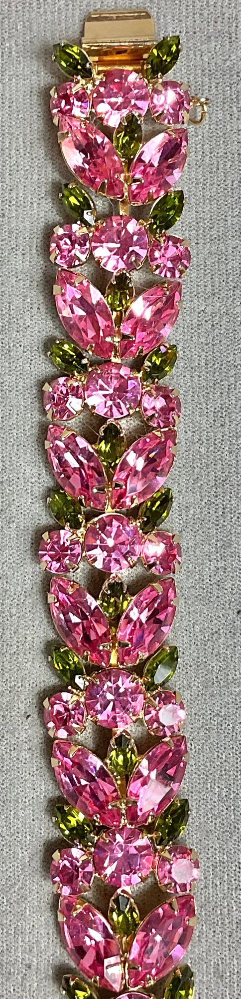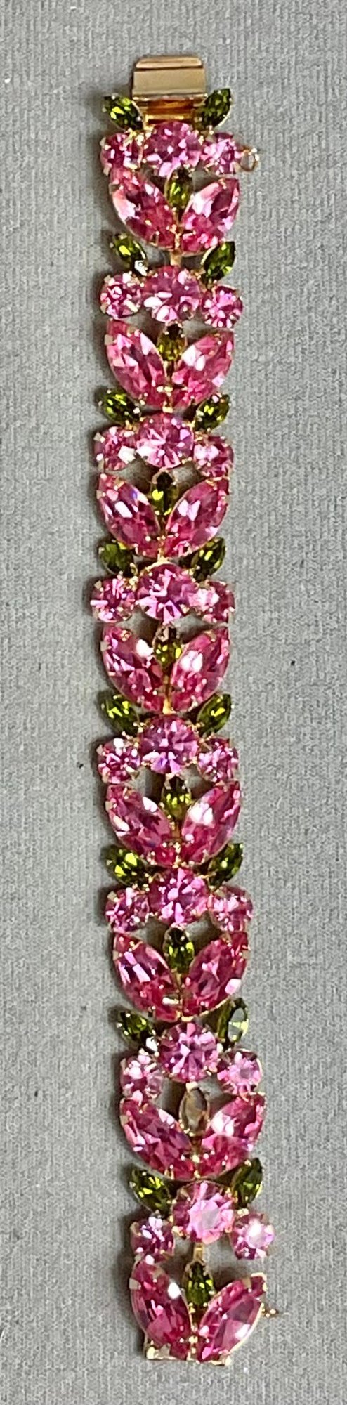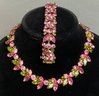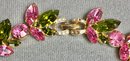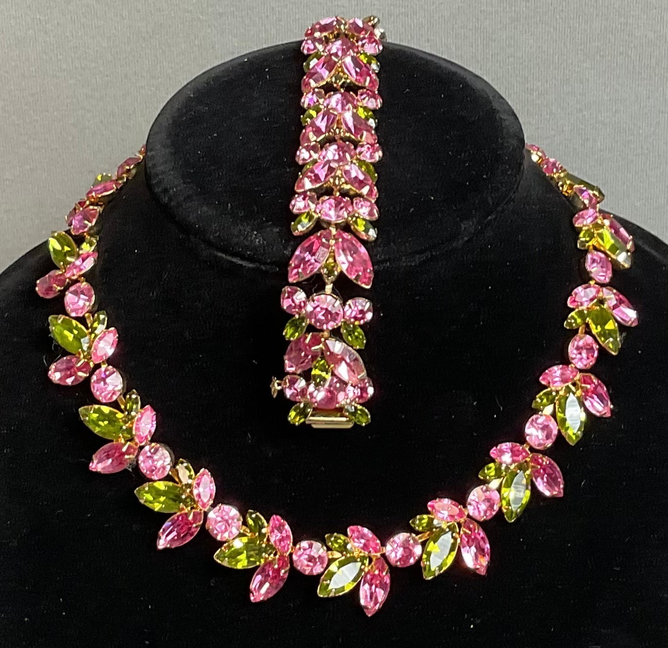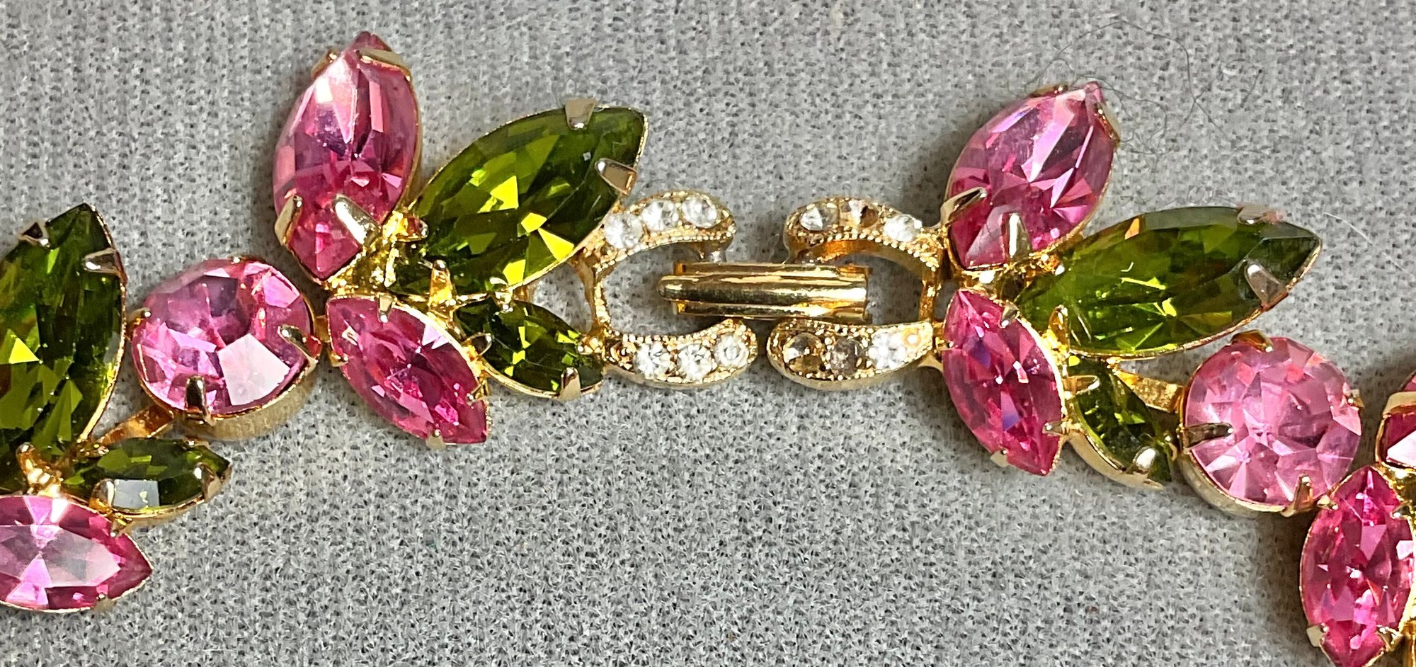 Beautiful 1960s Napier Pink/Green Rhinestone Necklace & Bracelet - necklace 16” (missing couple clear stones on clasp) - bracelet 7.5” (missing one stone) - good used condition