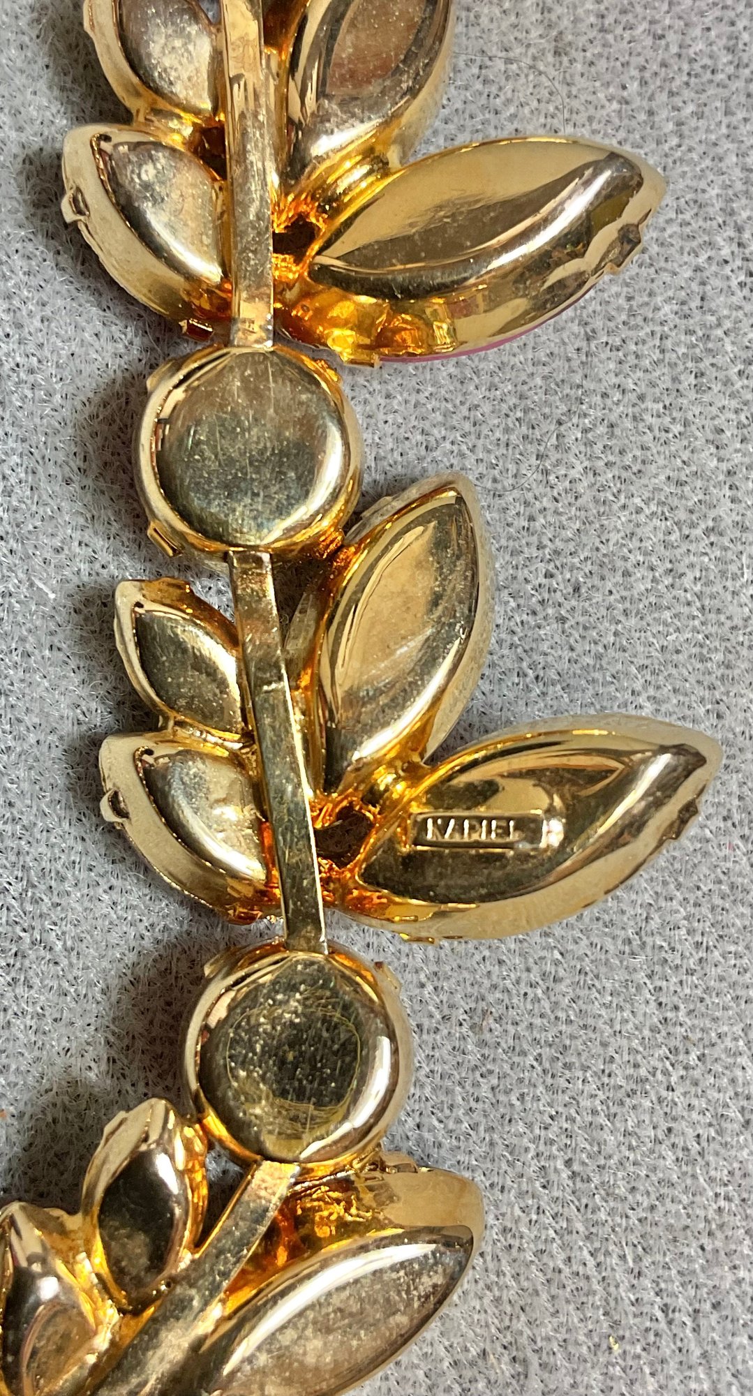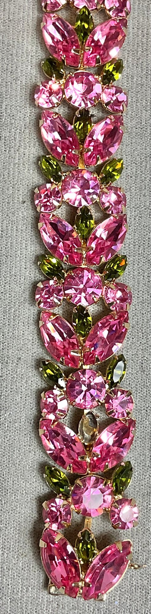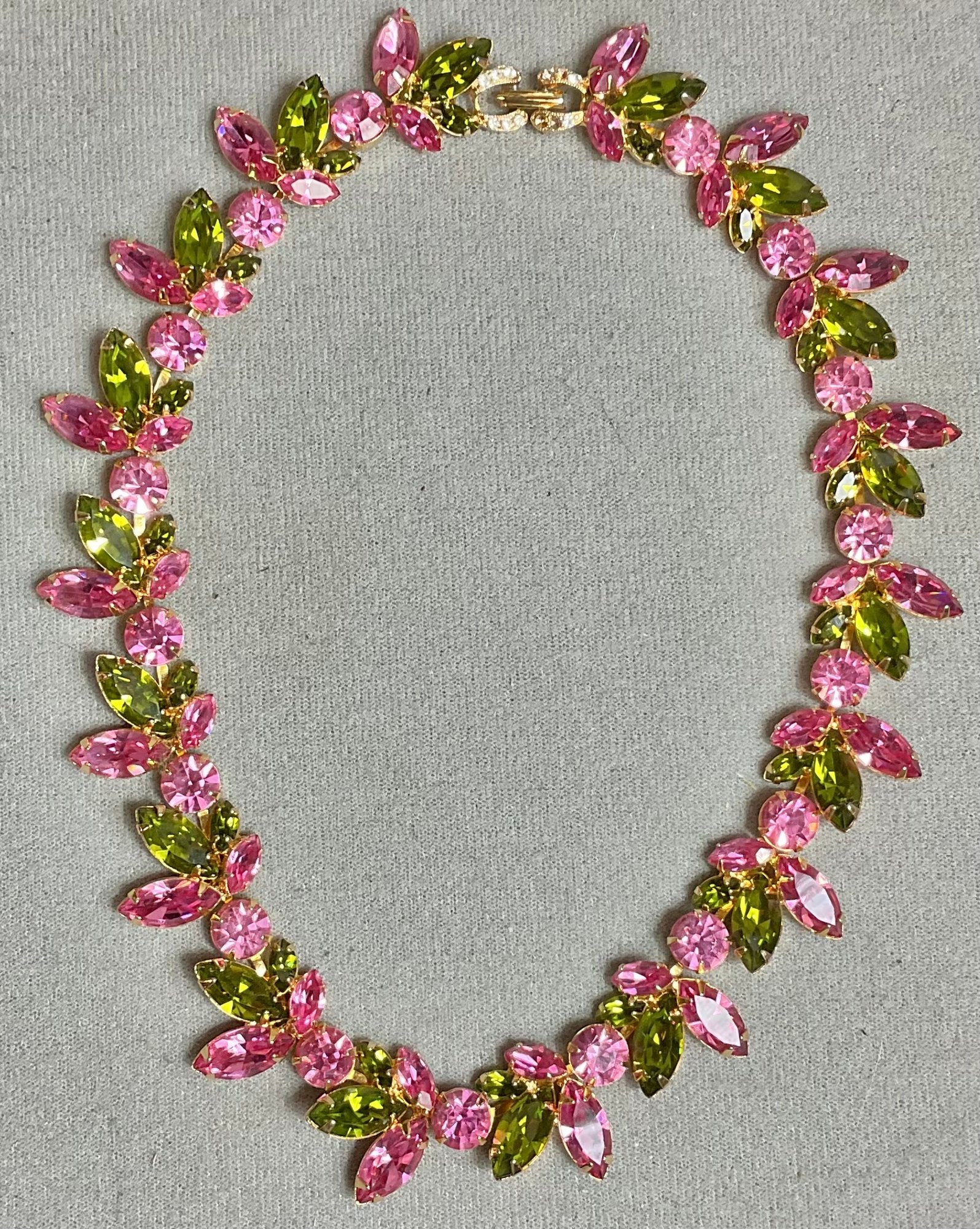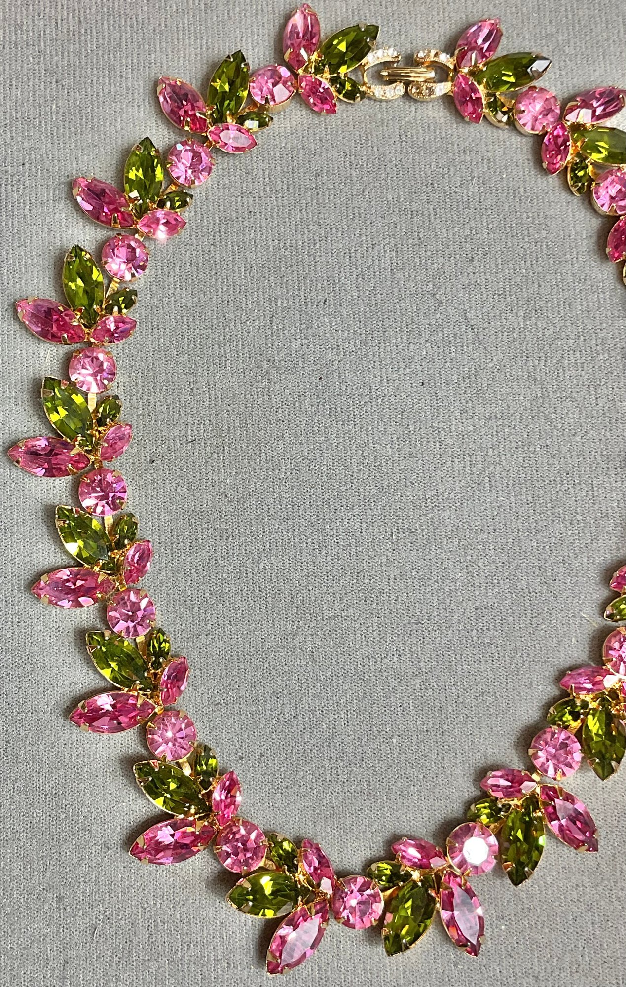Beautiful 1960s Napier Pink/Green Rhinestone Necklace & Bracelet - necklace 16” (missing couple clear stones on clasp) - bracelet 7.5” (missing one stone) - good used condition