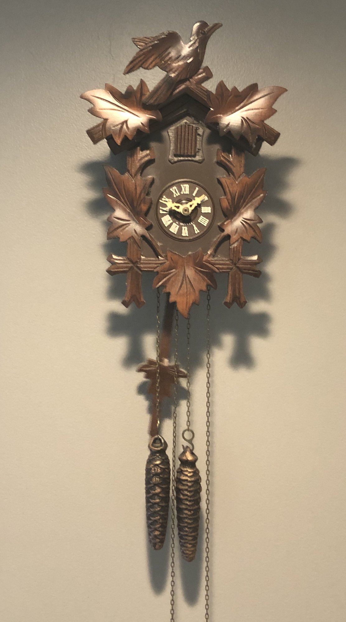 Black Forrest Cuckoo Clock - West Germany - works - 11" long x 7.75" wide - good used condition