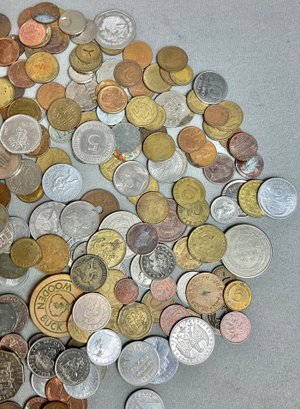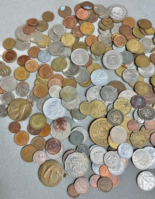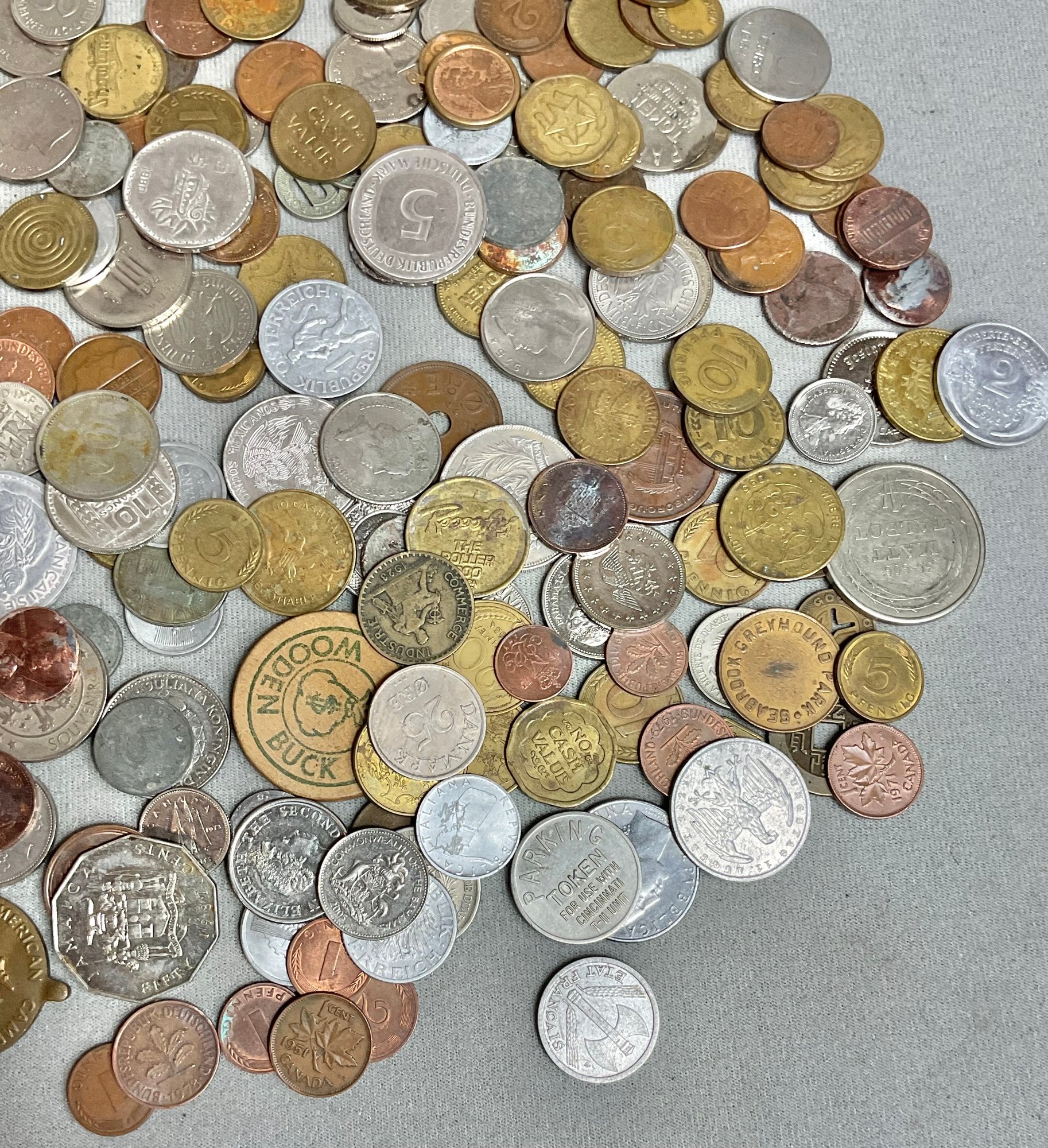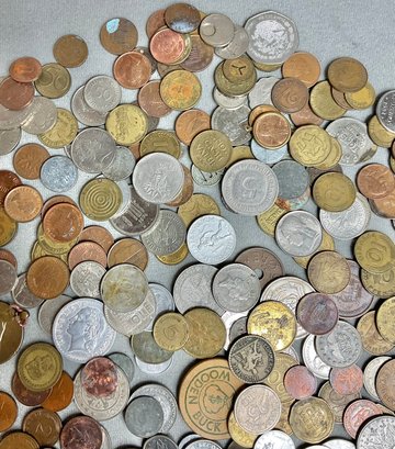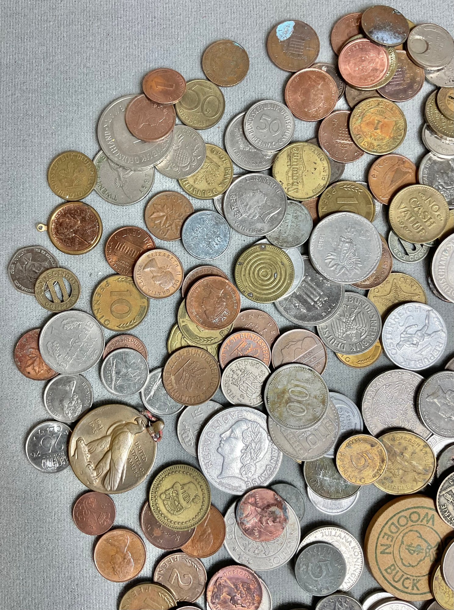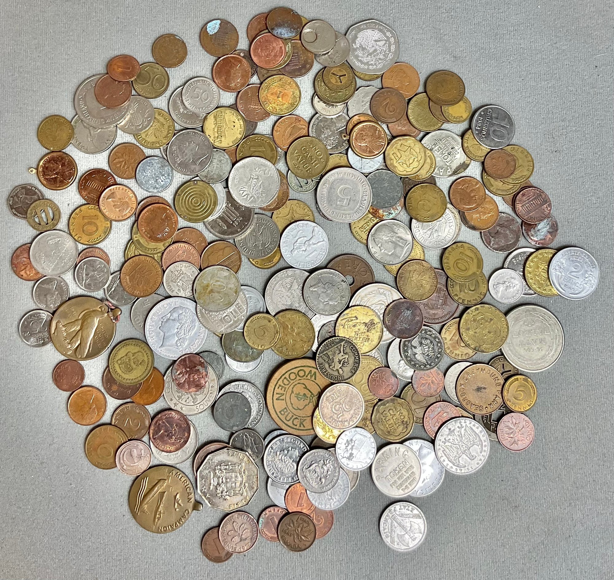 Container Full Foreign Coins/ Tokens/ Medals - as found in dresser - good used condition