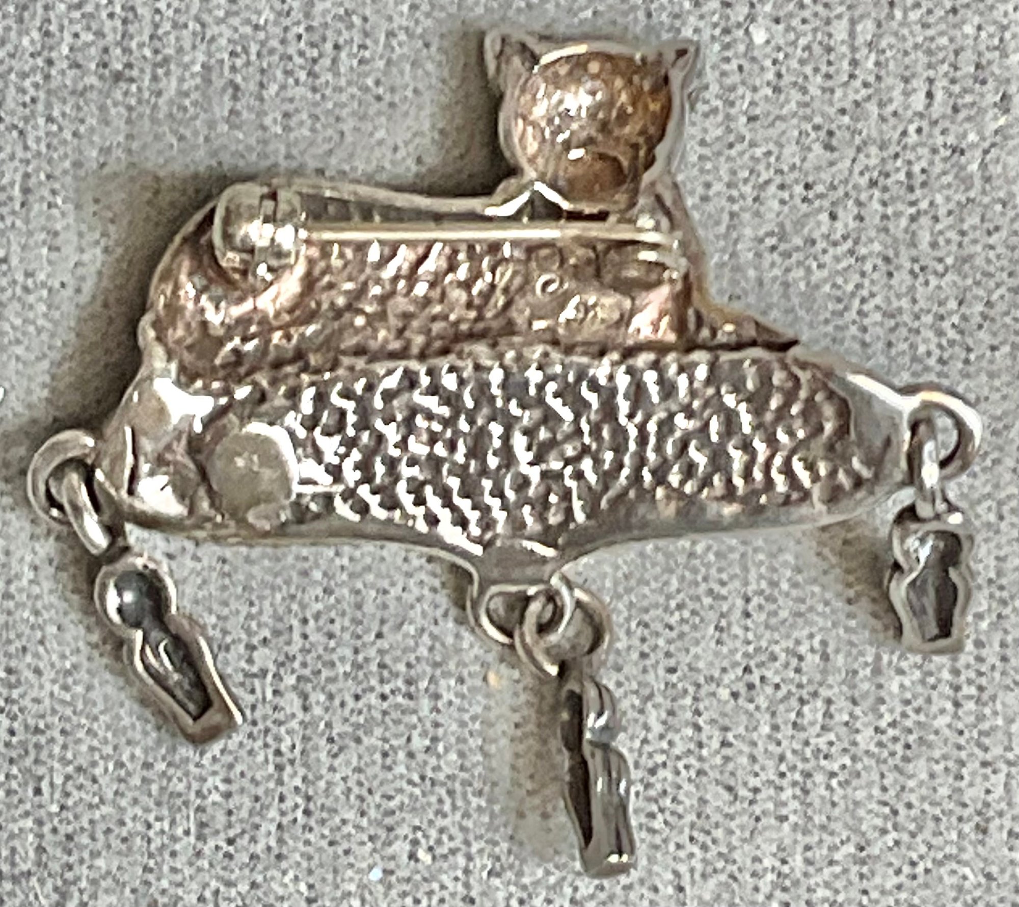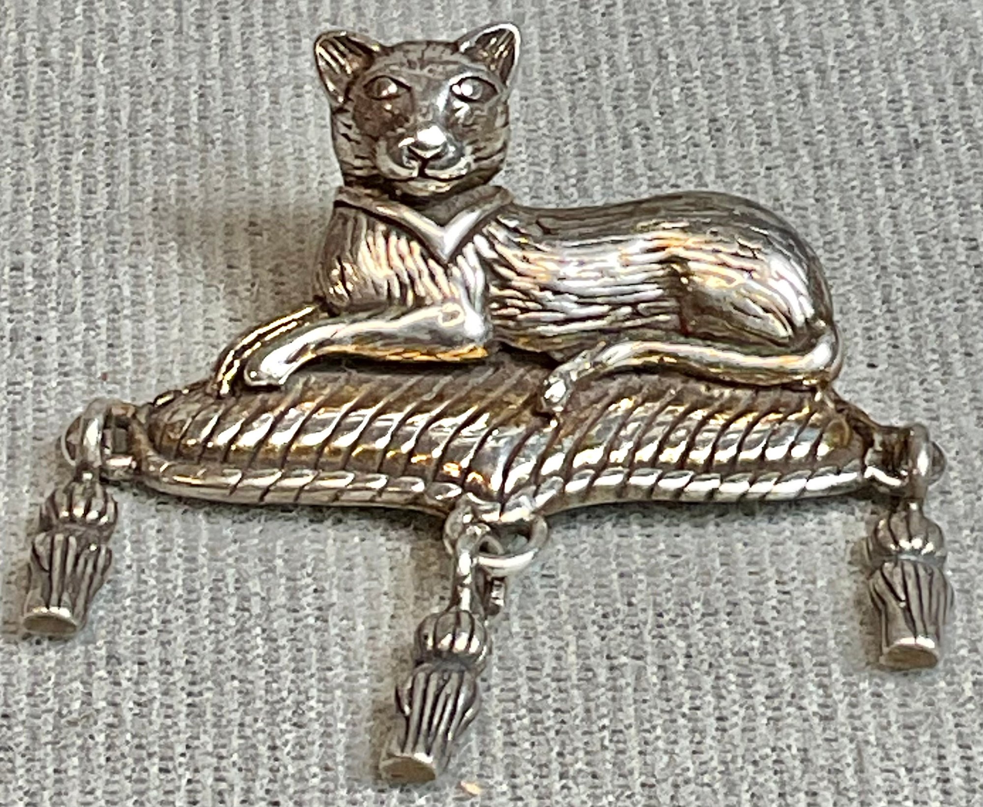 Designer Sterling Cat On Tasseled Pillow Brooch/ Pin - signed JEZ - 1 5/8” x 1.5” - weighs 9.8 grams - good used condition