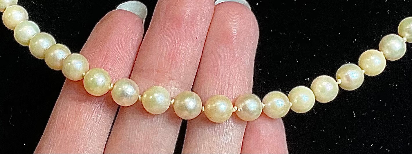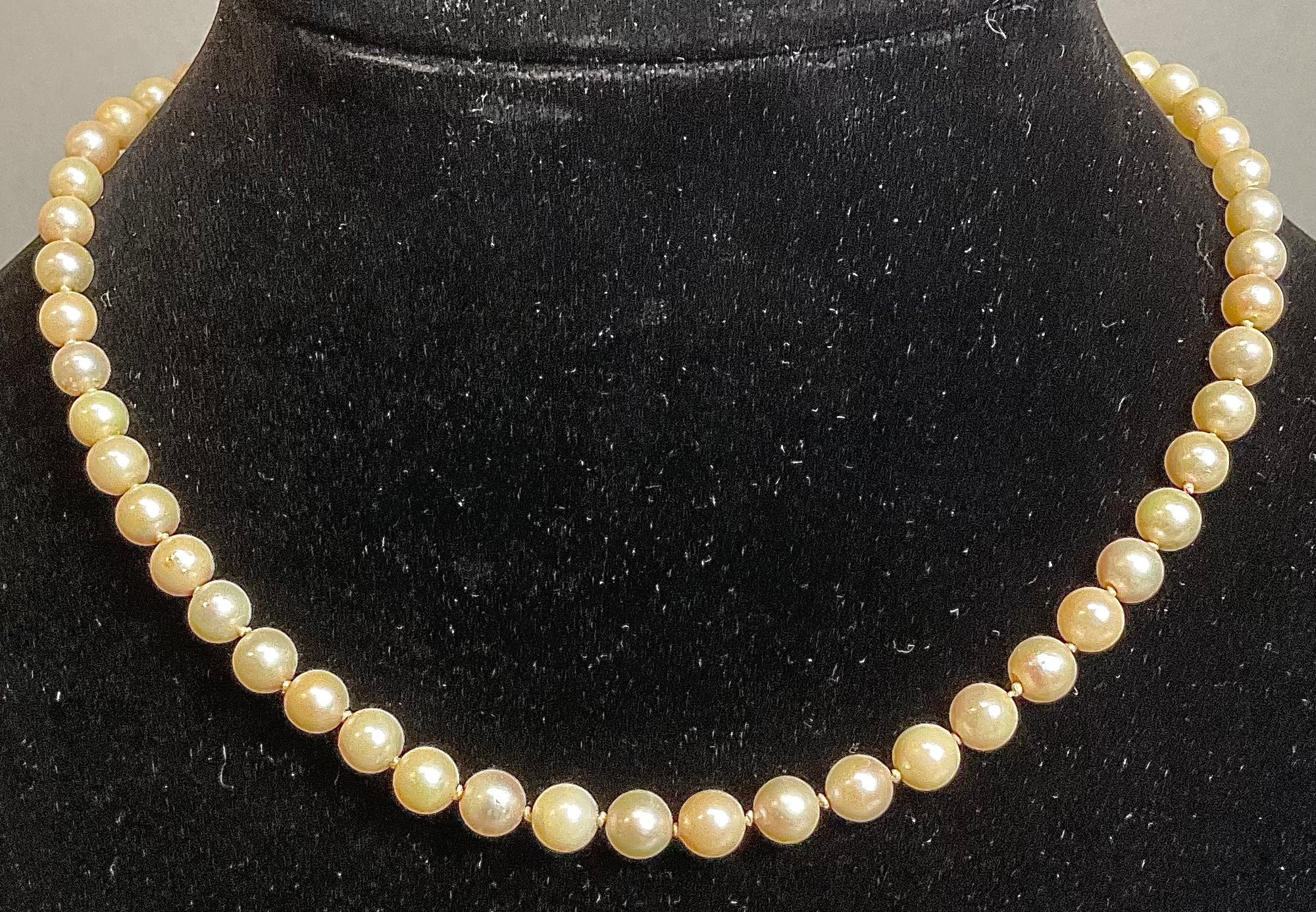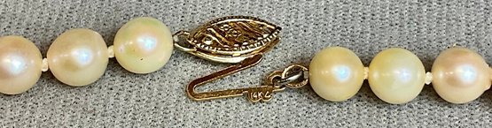 Pearl Necklace 14k Gold Clasp - 16” long - pearls 6.3mm - good used condition