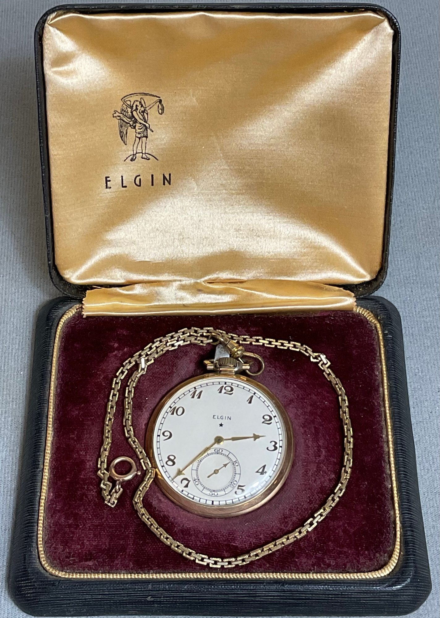 Elgin Pocket Watch In Original Box - made 1938 - grade 498 model 4 - 12 size - 21 jewel - 10k gold filled case and gold filled chain - runs but not checked for accuracy - great used condition