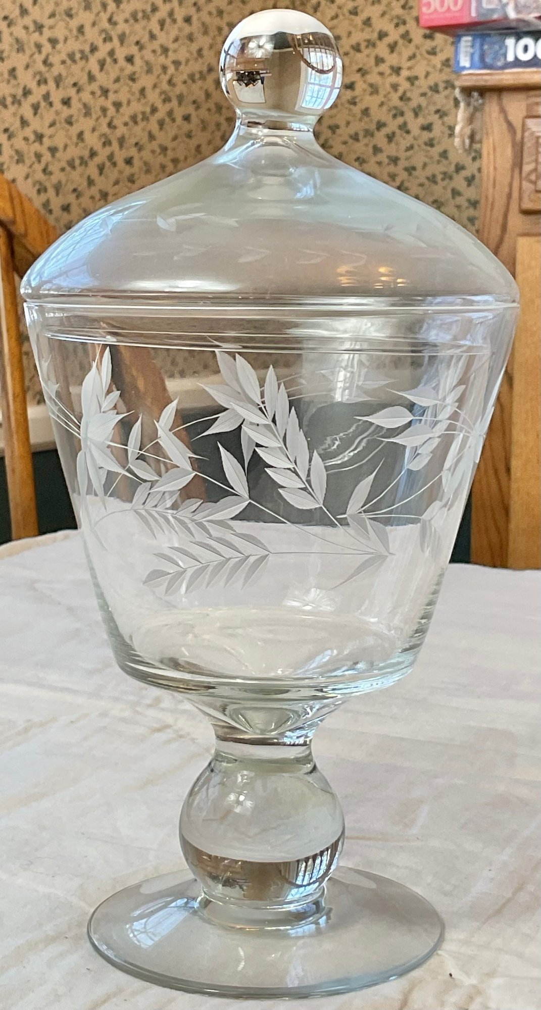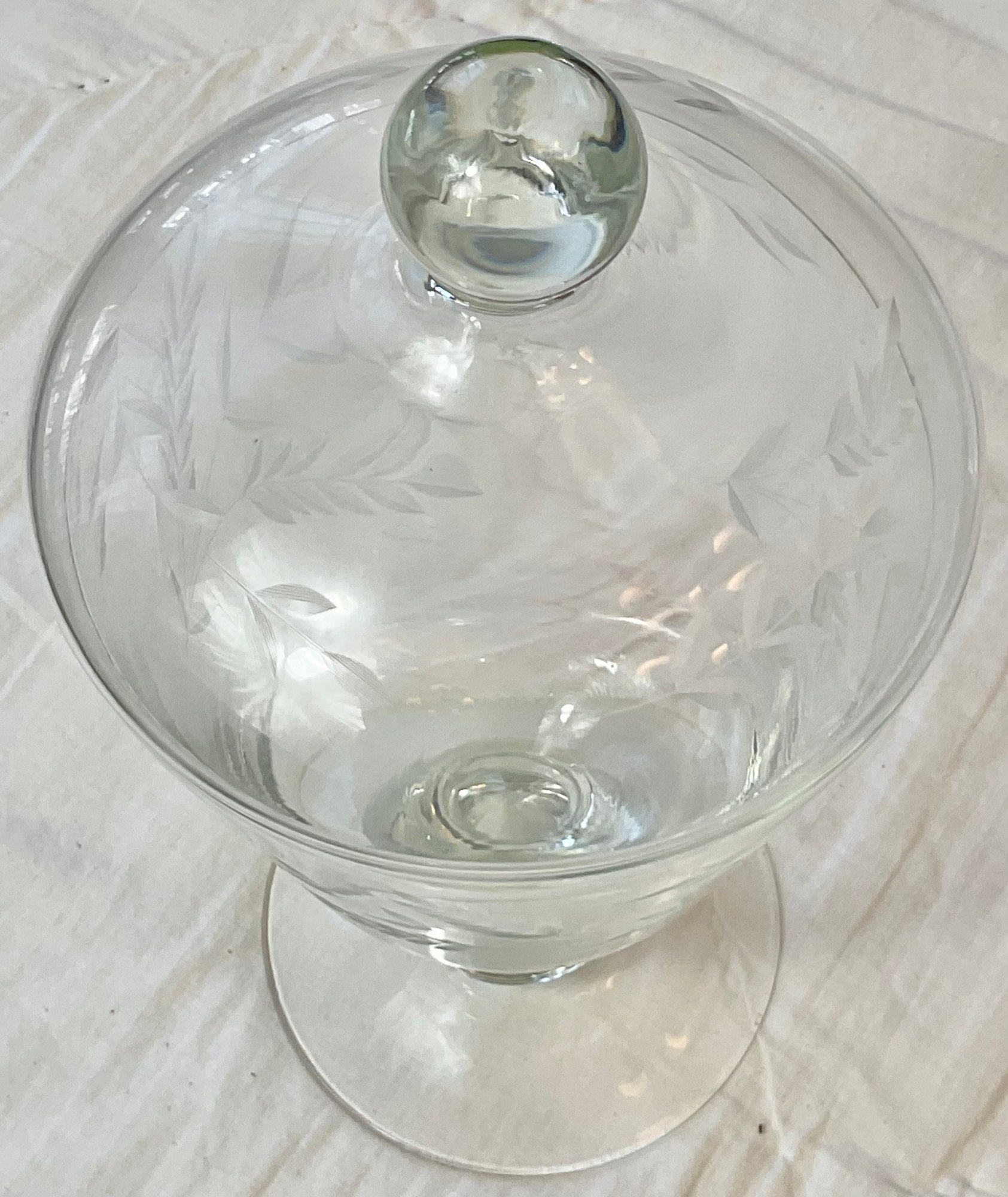 Etched Glass Covered Candy Dish - small rim flea bite - 9.5” tall - good used condition