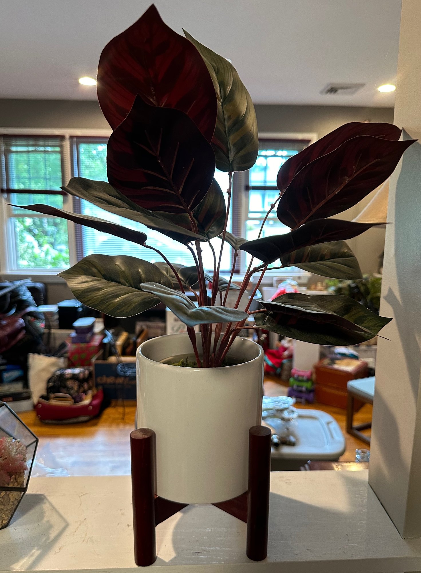 Faux Potted Plant On Wooden Stand - 6'' x 9'' - 23'' tall with plant - good used condition
