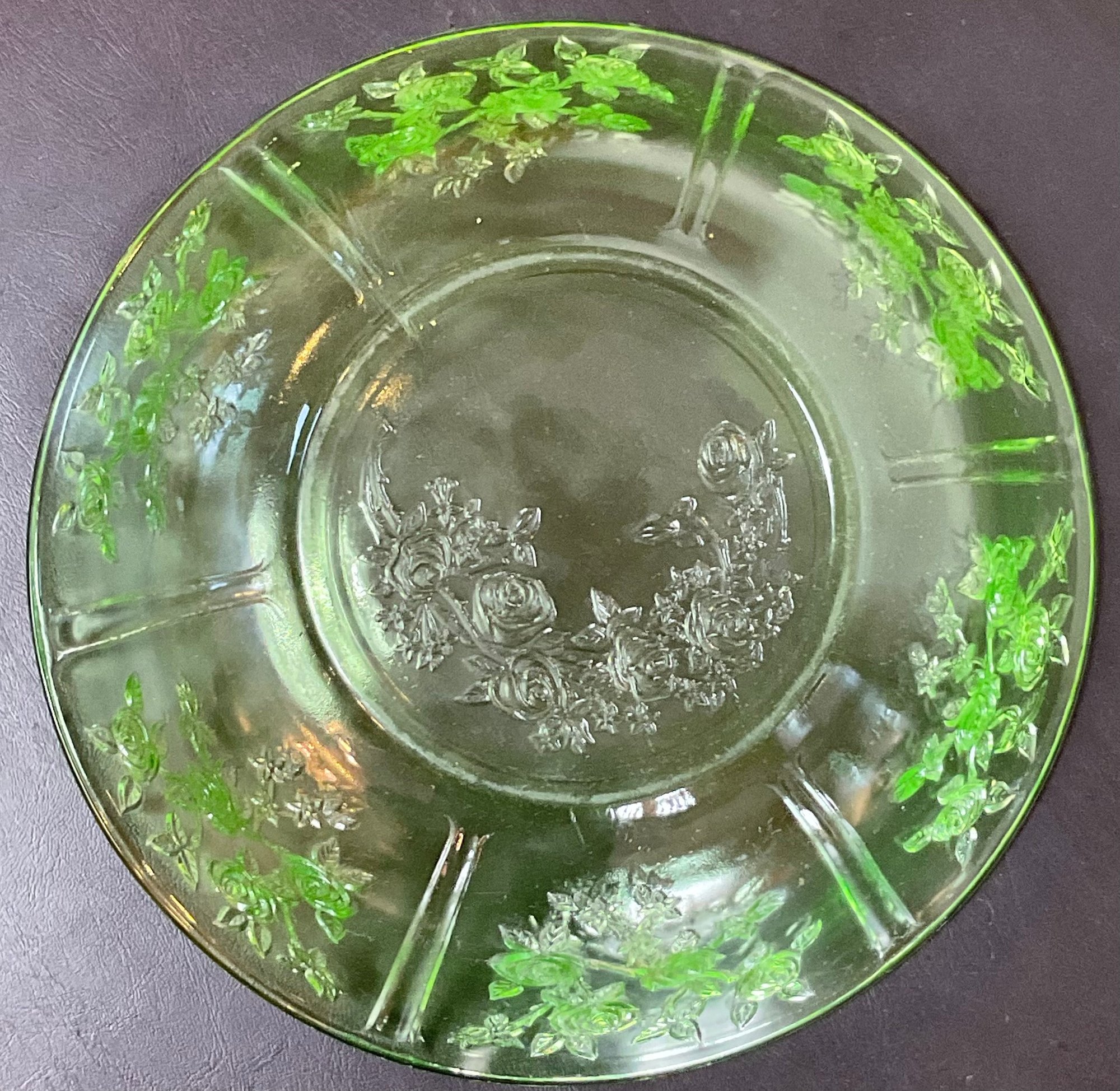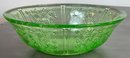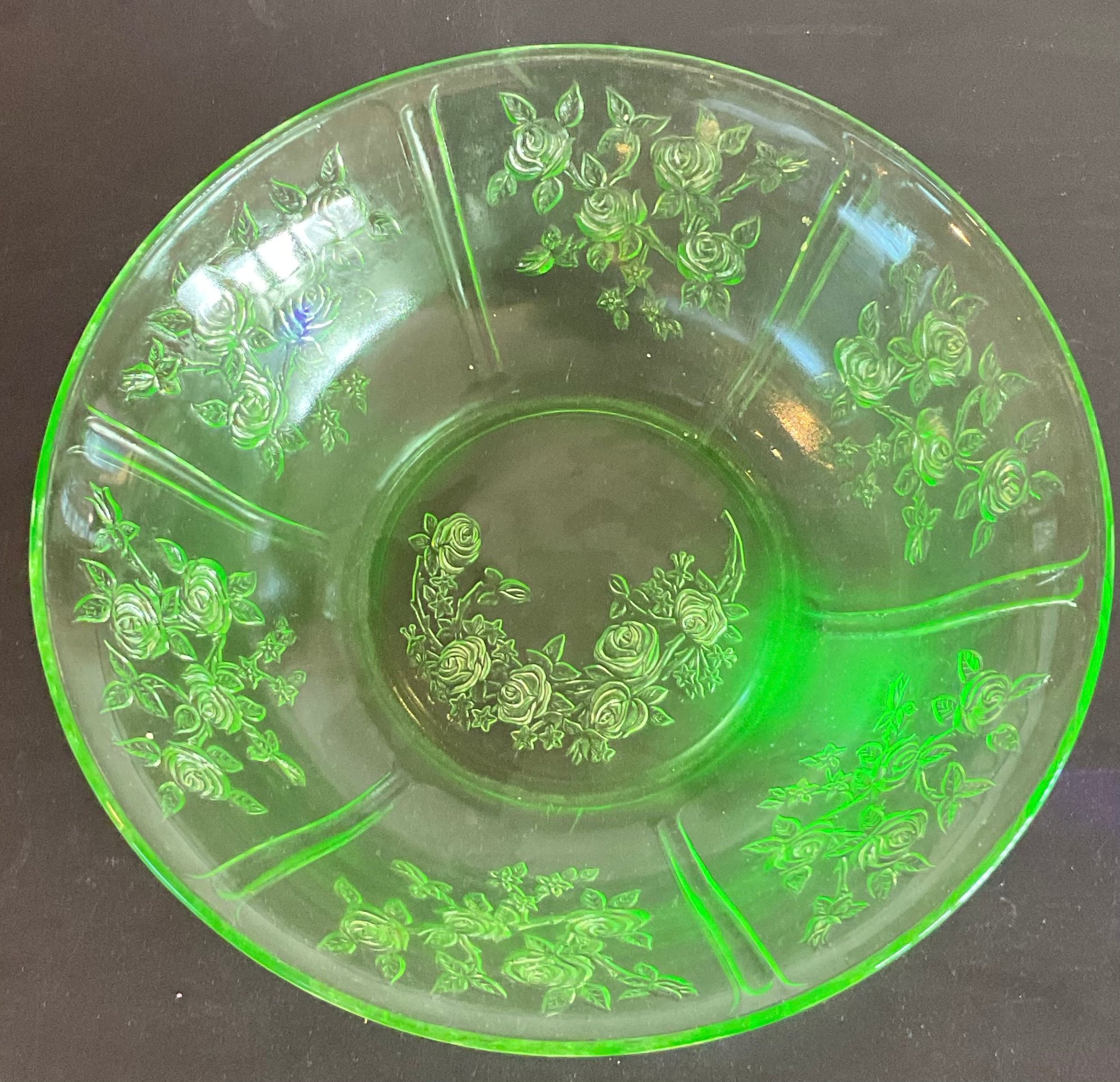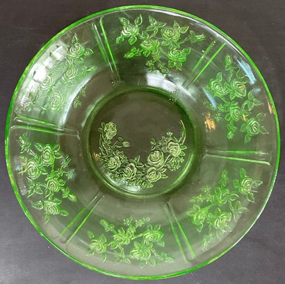 Federal Uranium Glass Sharon Cabbage Rose Fruit Bowl - no chips - glows with black light - 3” tall x 10 1/8” round - good used condition