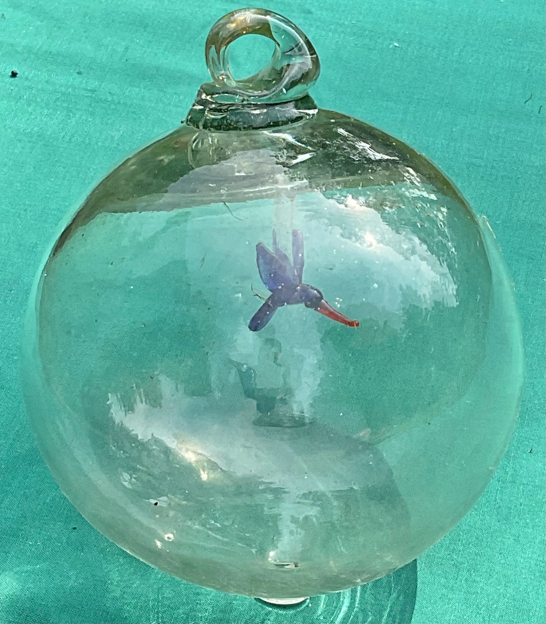 Hand Blown Glass Hanging Humming Bird Ball - 6” round - good used condition